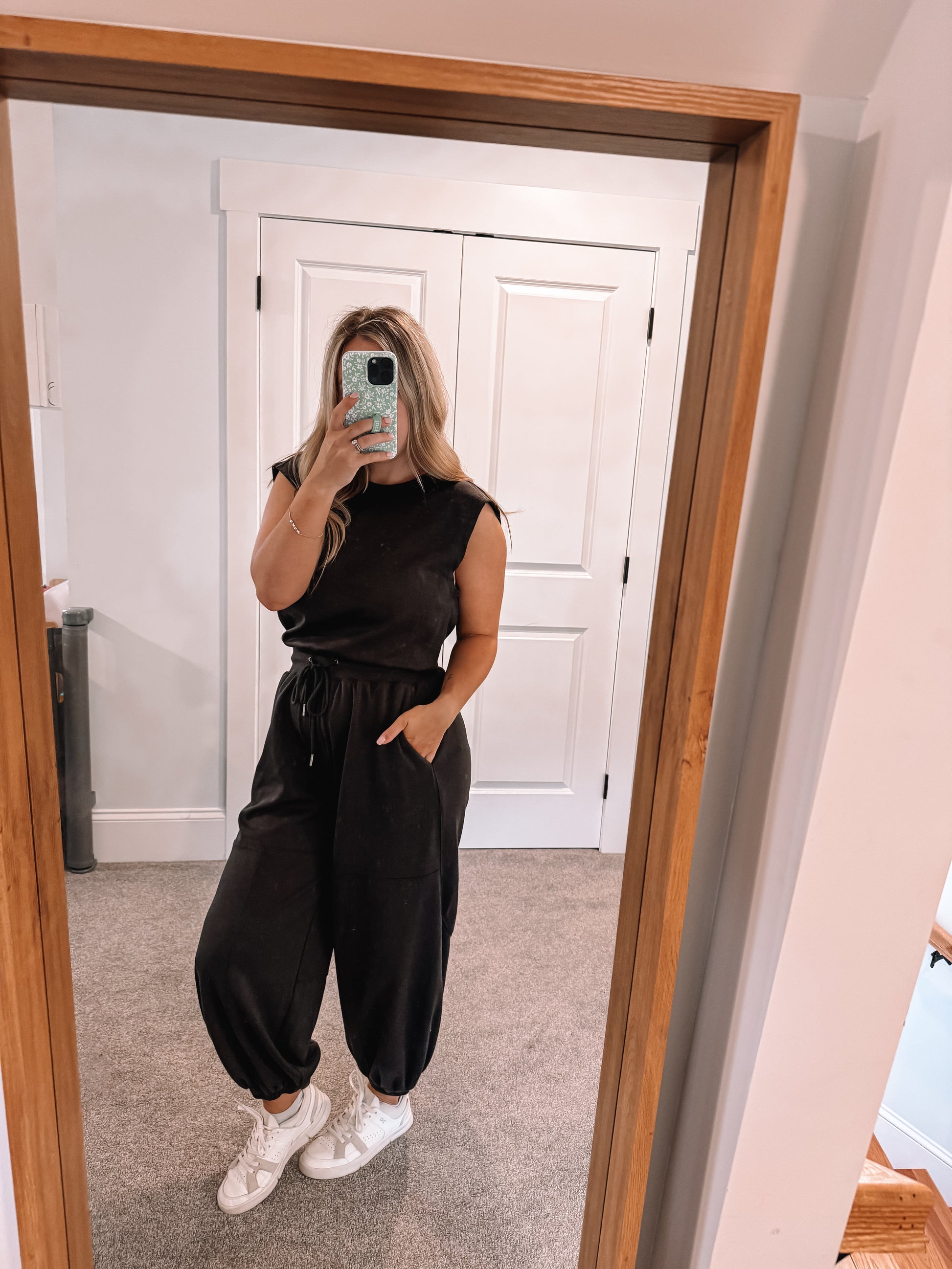 Our Amber Jumpsuit has a sleeveless knit active jumpsuit with a drawstring waist and pockets! the softest material and an effortless grab and go option. Wearing a size small.