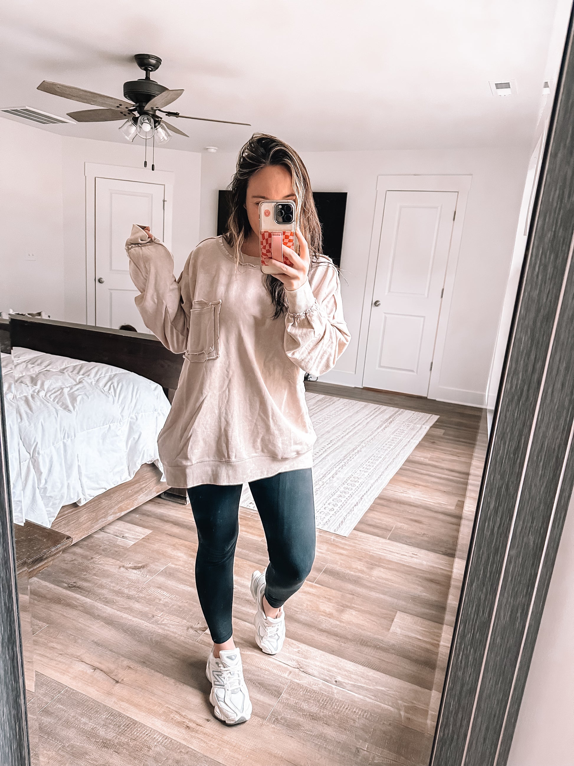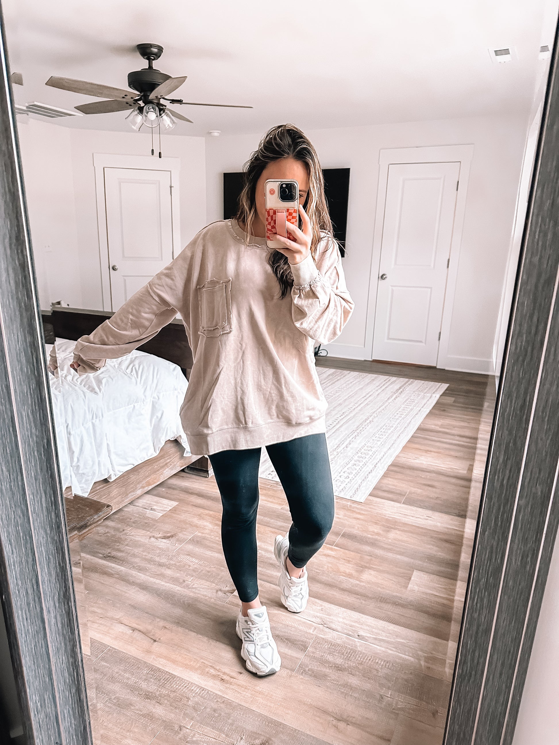 Our Amy Pullover is the perfect french terry acid washed long sleeve with pockets. Elevate your look with the cutest patch on the back and raw edge front pocket detail. Basic top to go with leggings or jeans, easy to dress up or down.
