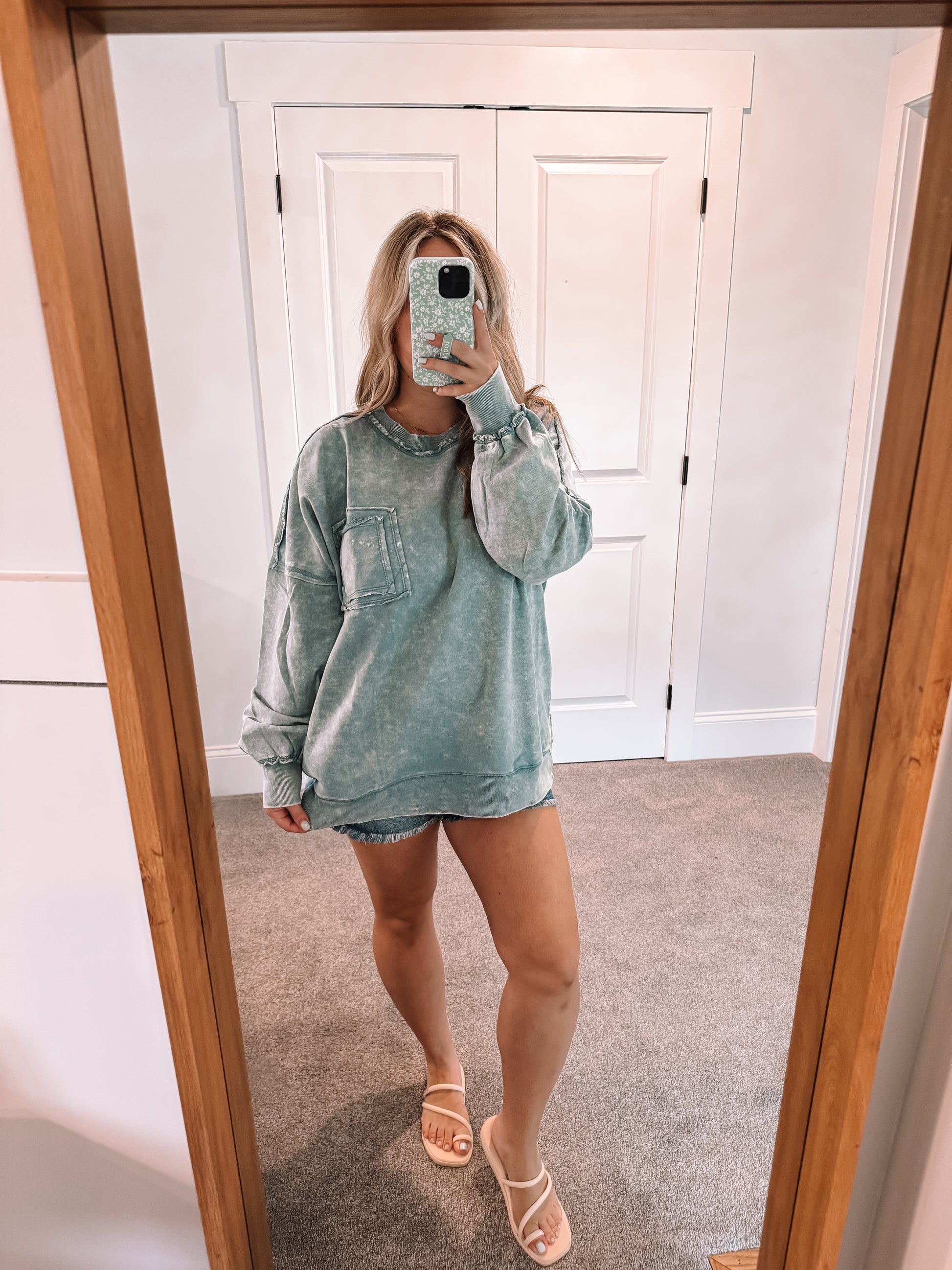 Our Amy Pullover is the perfect french terry acid washed long sleeve with pockets. Elevate your look with the cutest patch on the back and raw edge front pocket detail. Basic top to go with leggings or denim, easy to dress up or down. Loose oversized fit.