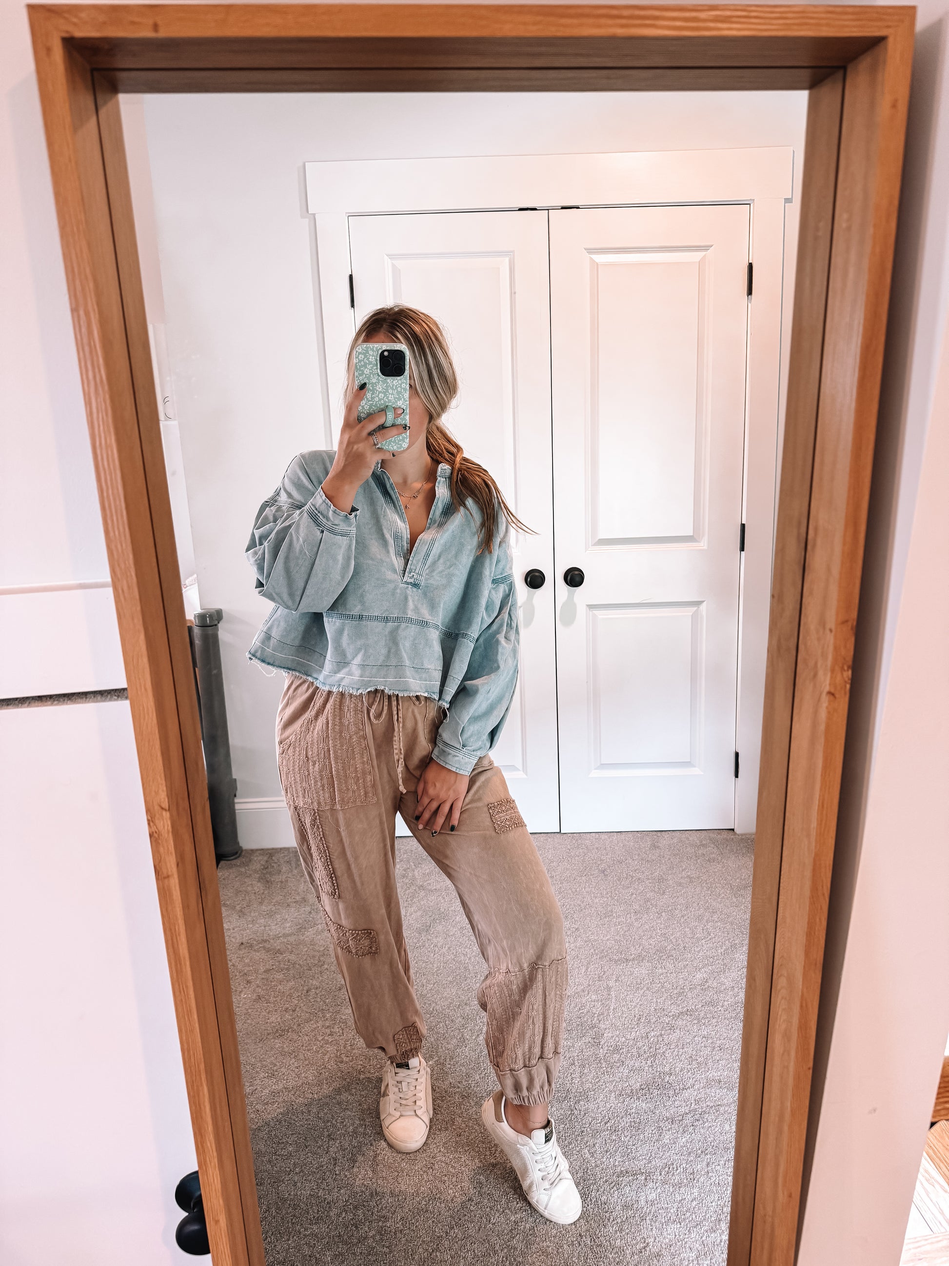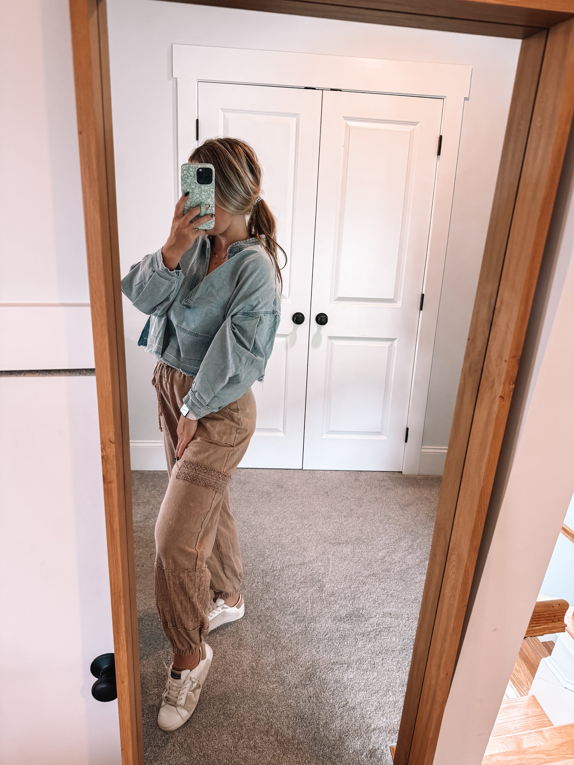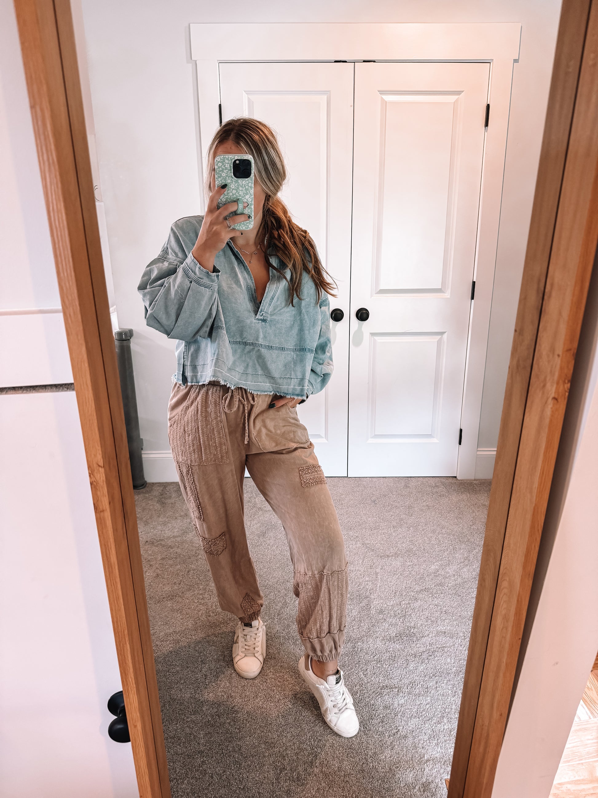 Our Bethany Boho joggers are the perfect addition to your fall wardrobe. Mineral washed, elastic waistband and cuffed jogger style - perfect trendy piece while also meant for comfort. Wearing a size small.