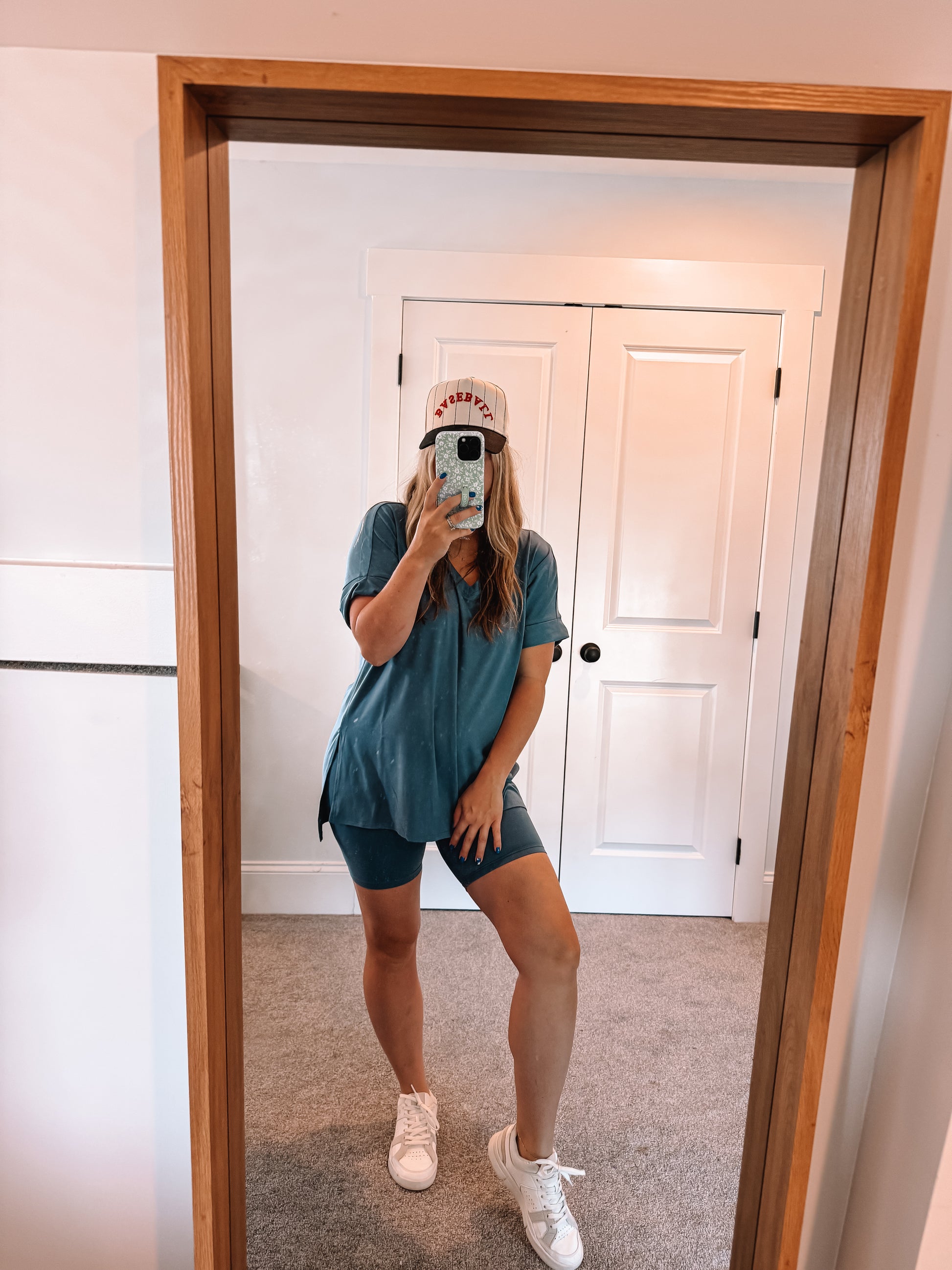 Our biker set in Dusty Blue is made from buttery soft microfiber that gently hugs your skin. Its flattering V-neck and stylish hi-low top design make it ideal for everyday wear, effortlessly combining elegance and ease. Elevate your daily wardrobe with this versatile staple.