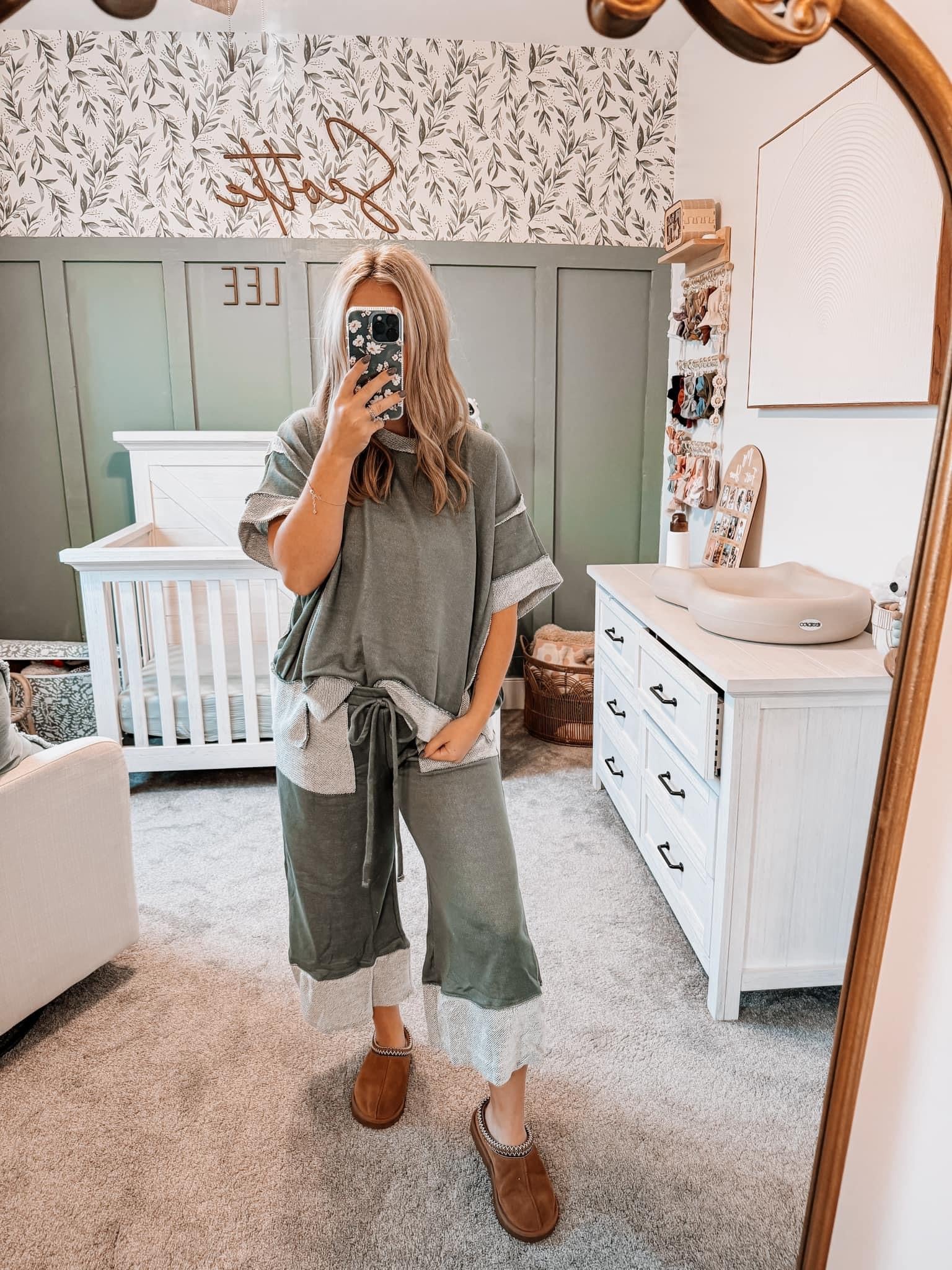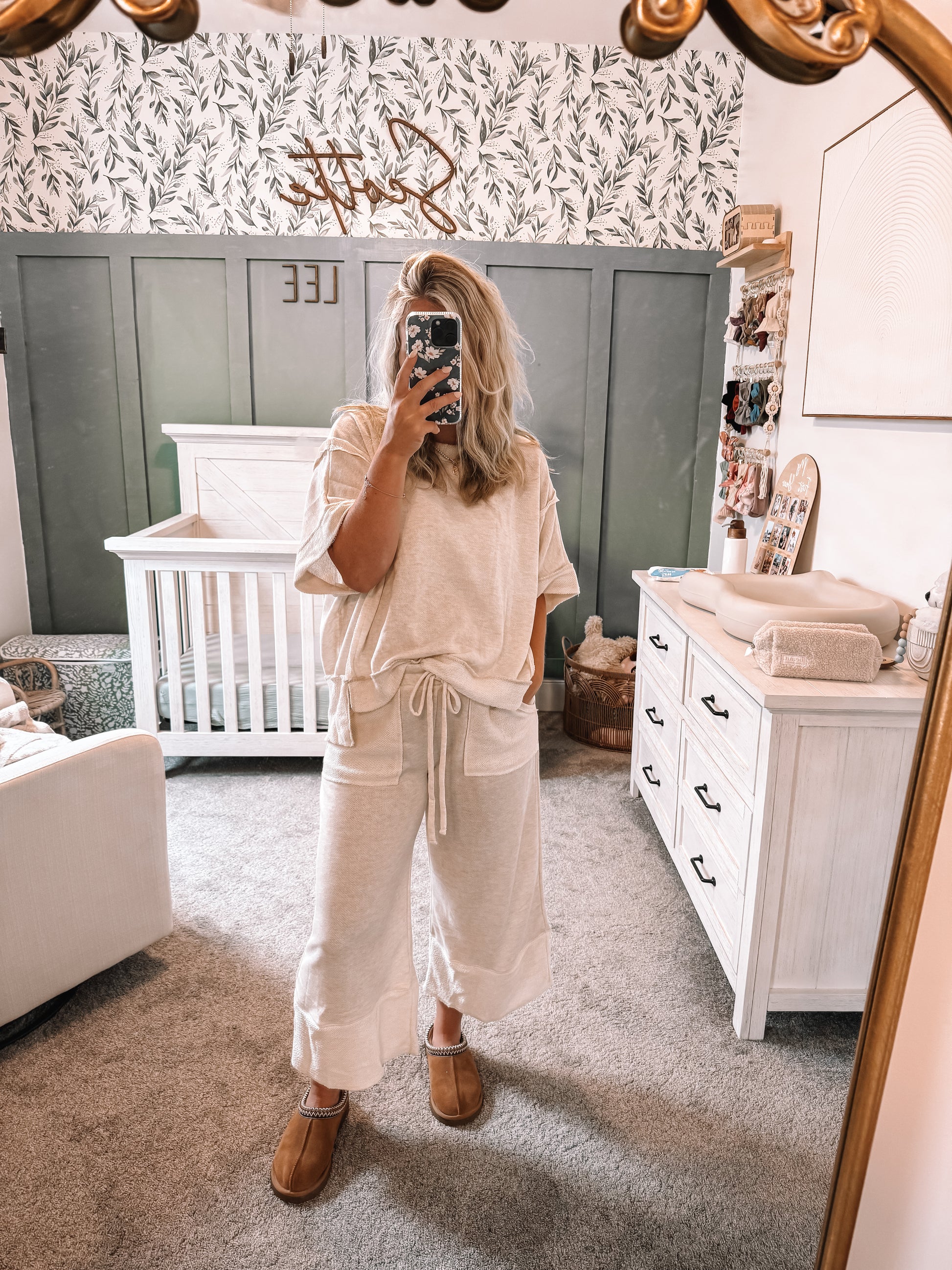 Our Callie Pant Set will be your go to fit all year long. This loose fit provides top notch comfort to lounge around in or throw on and run your day to day errands. The wide leg pants have an elastic waist band and drawstring with pockets. Wearing a size small.