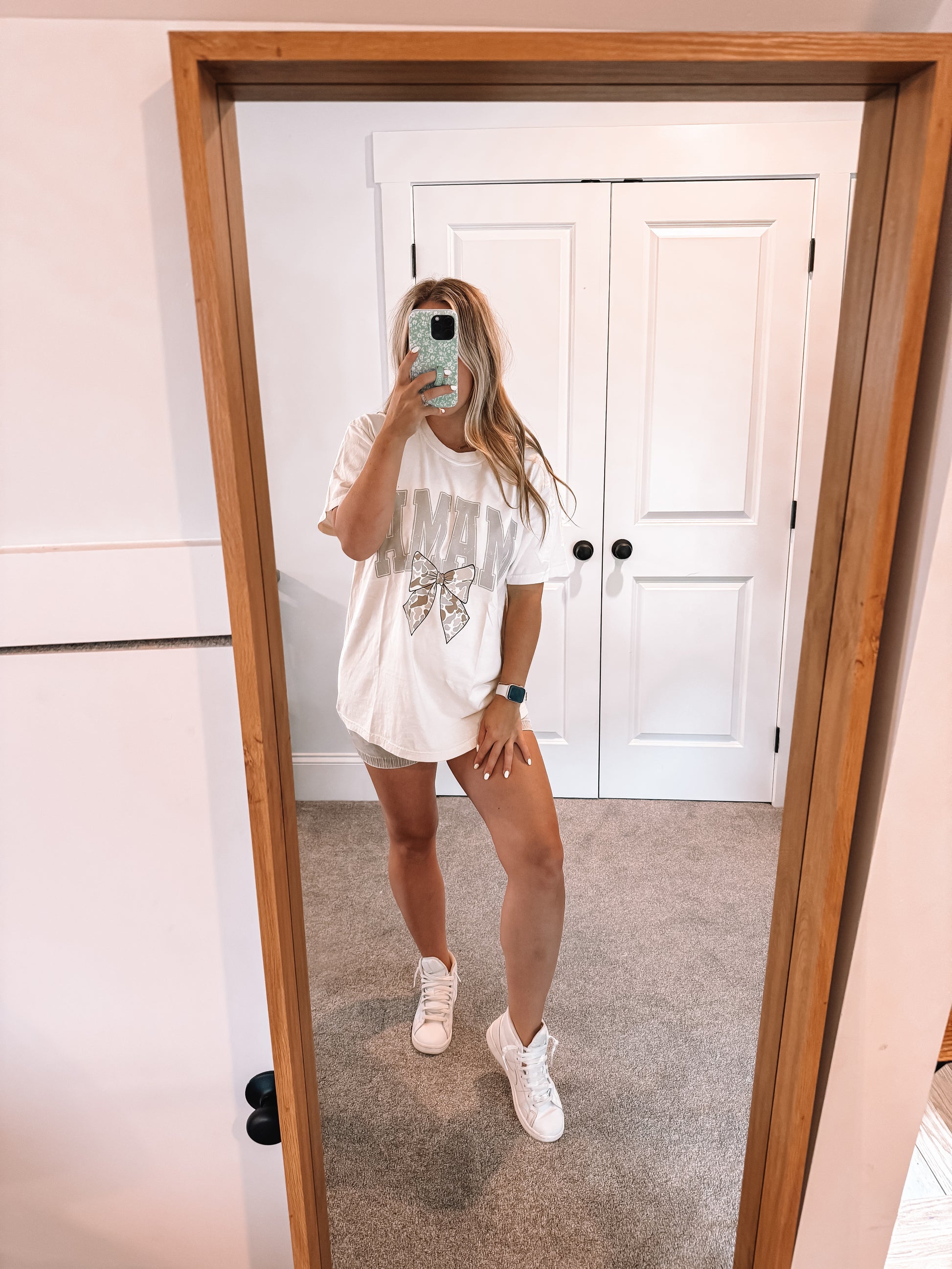 Our mama graphic is printed on a comfort colors tee with a combo of creams/green and camo with a loose fit - size up for an oversized look. Wearing a size large for reference.