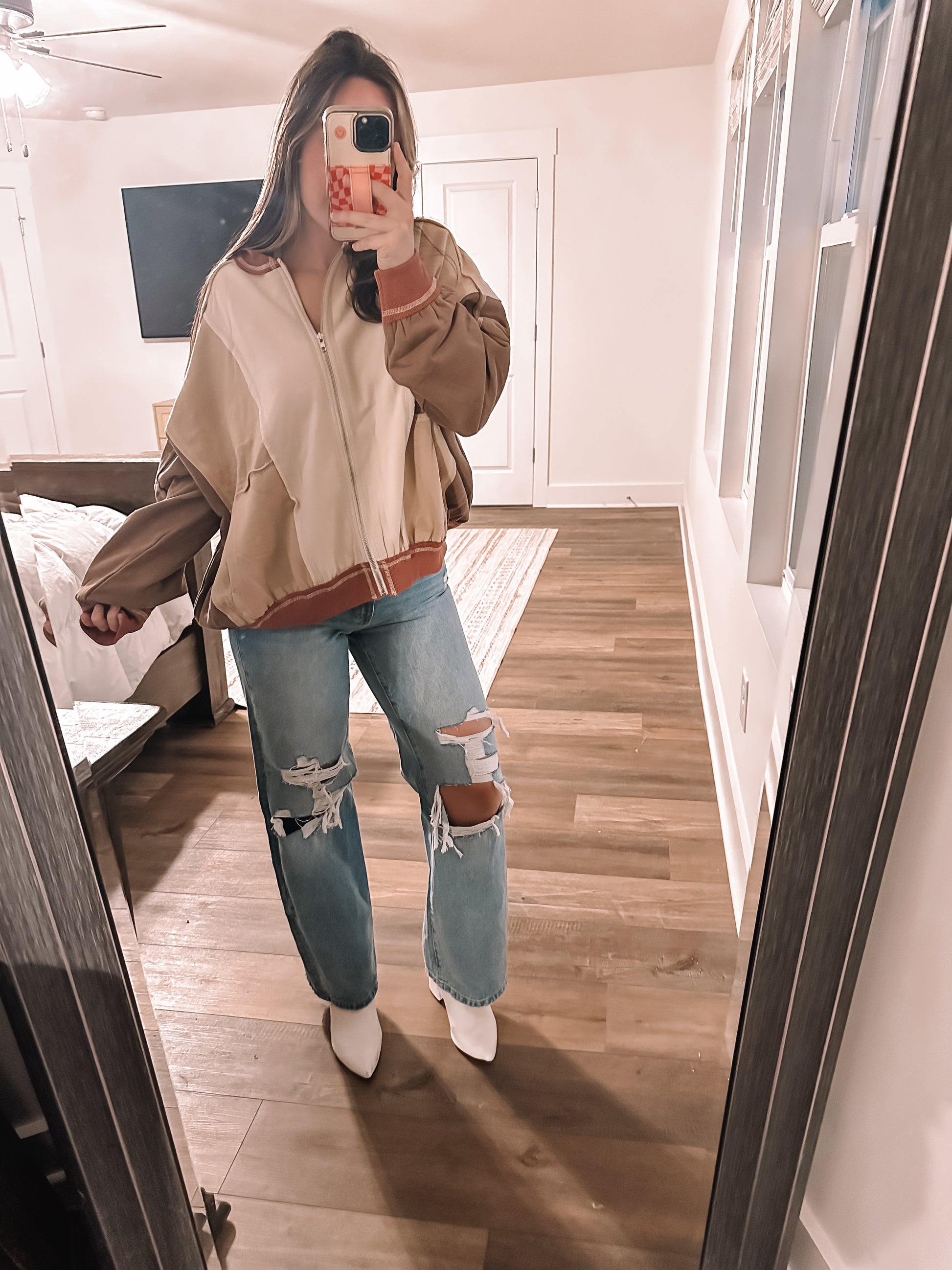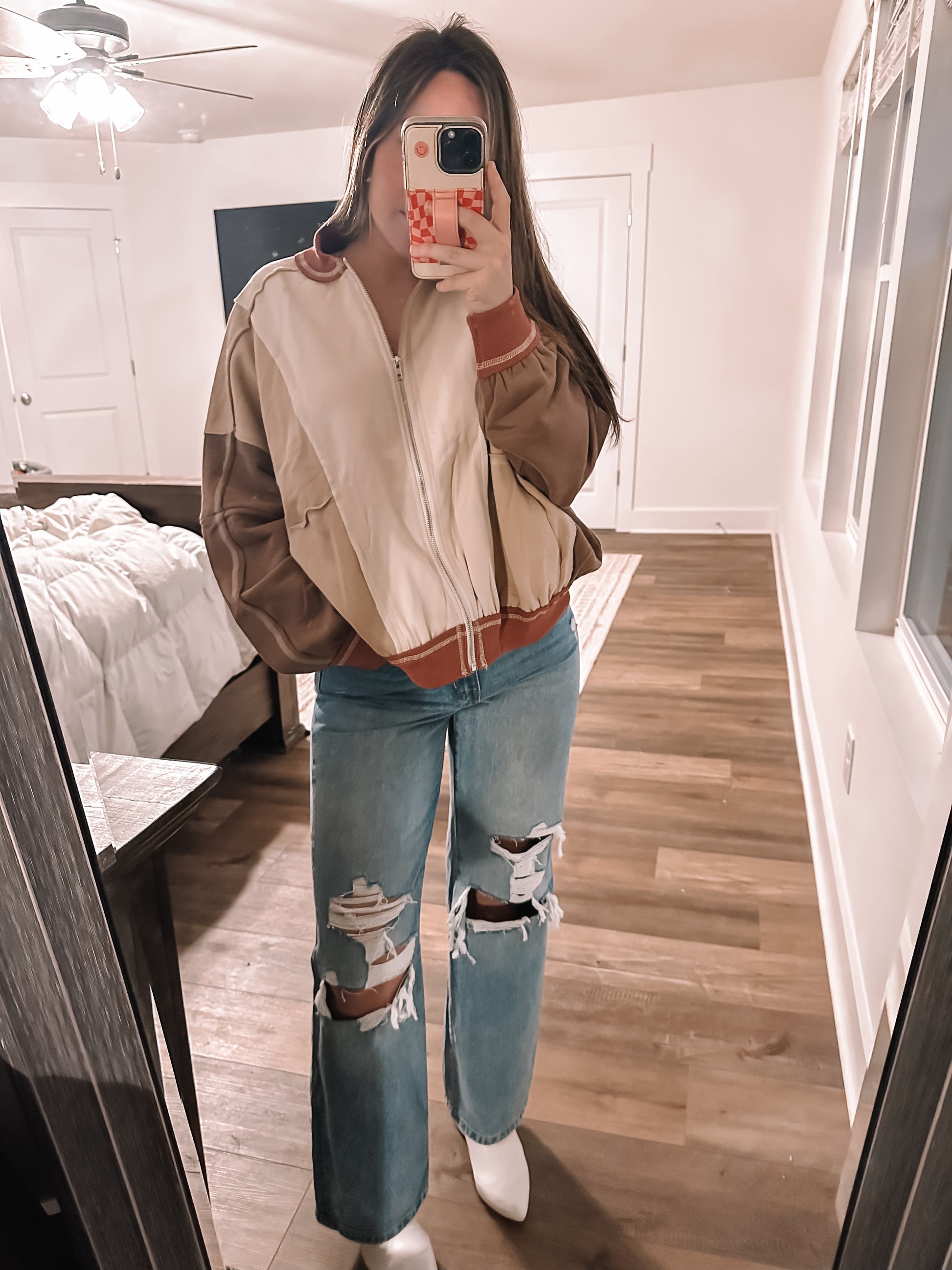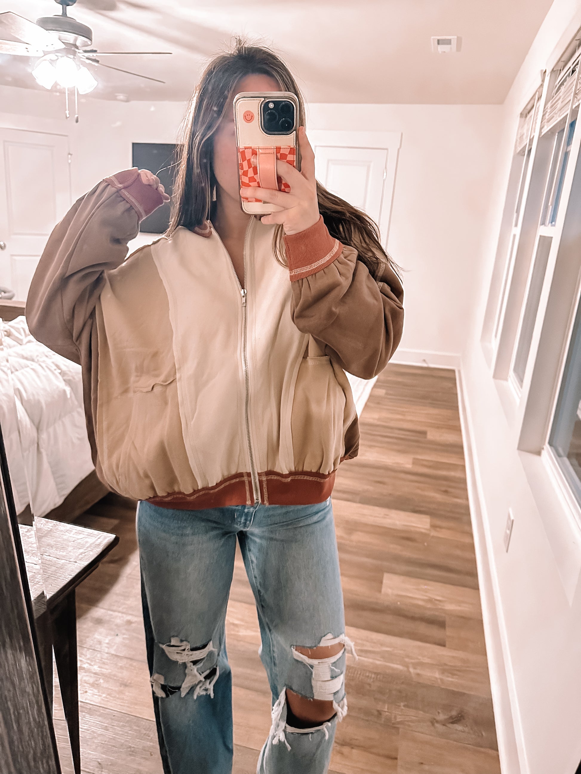 Our Cindy Colorblock Jacket is a casual oversized fit with banded arm cuffs and side pockets. Model is wearing a S/M.