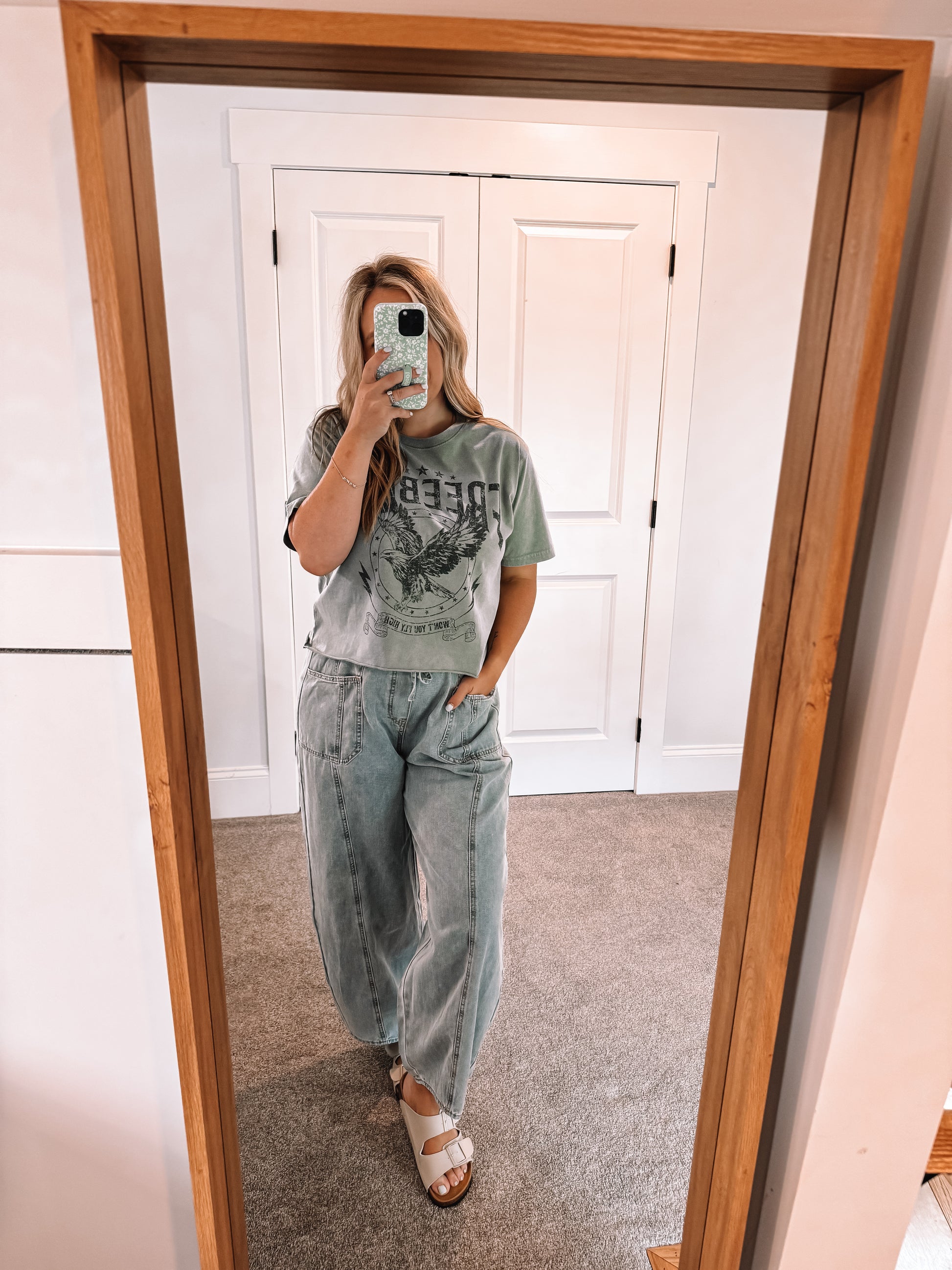 Our Cropped Free Bird Graphic is a vintage mineral wash tee with raw hem edge detailing. Relaxed fit, stick true to size.