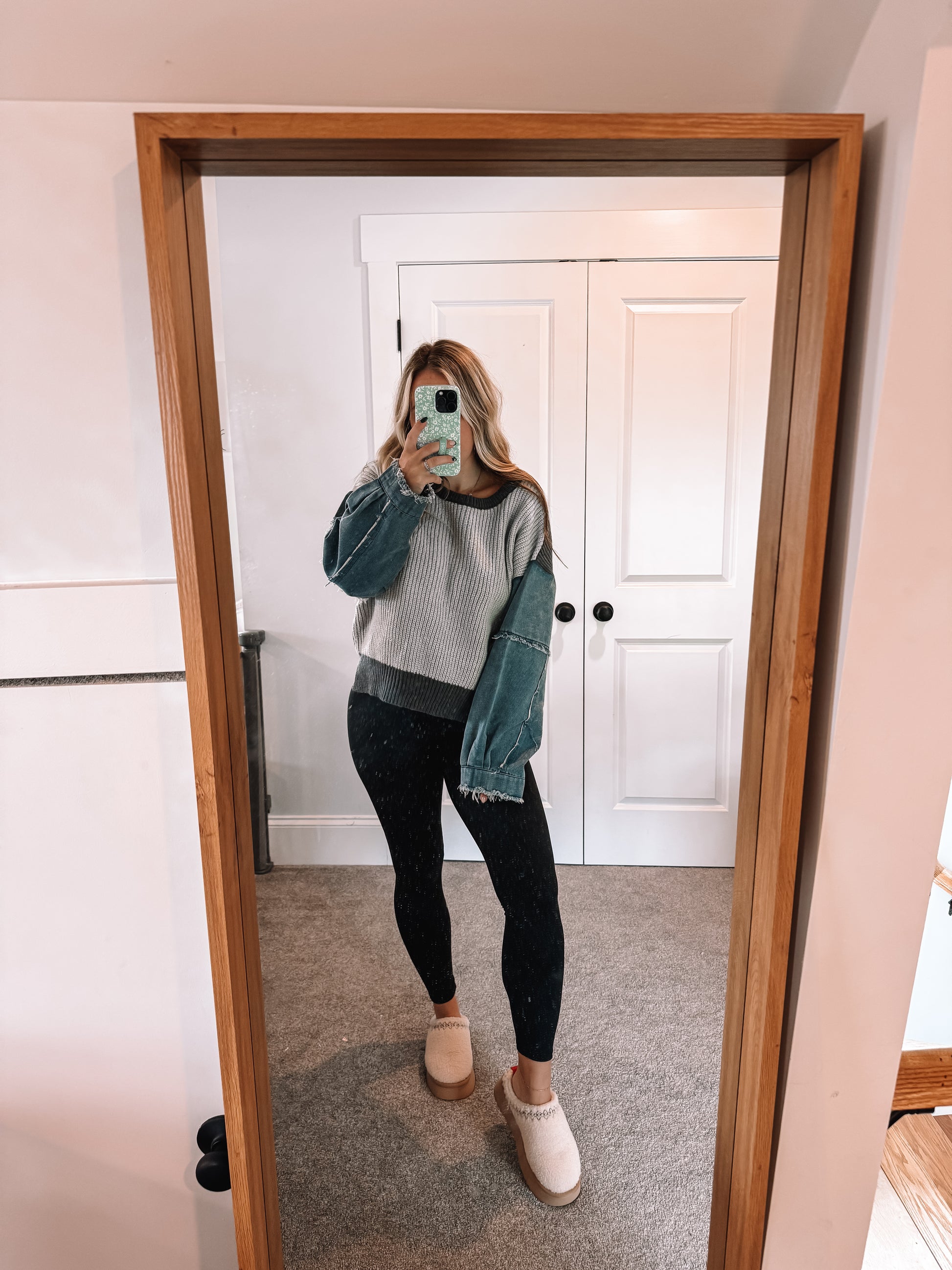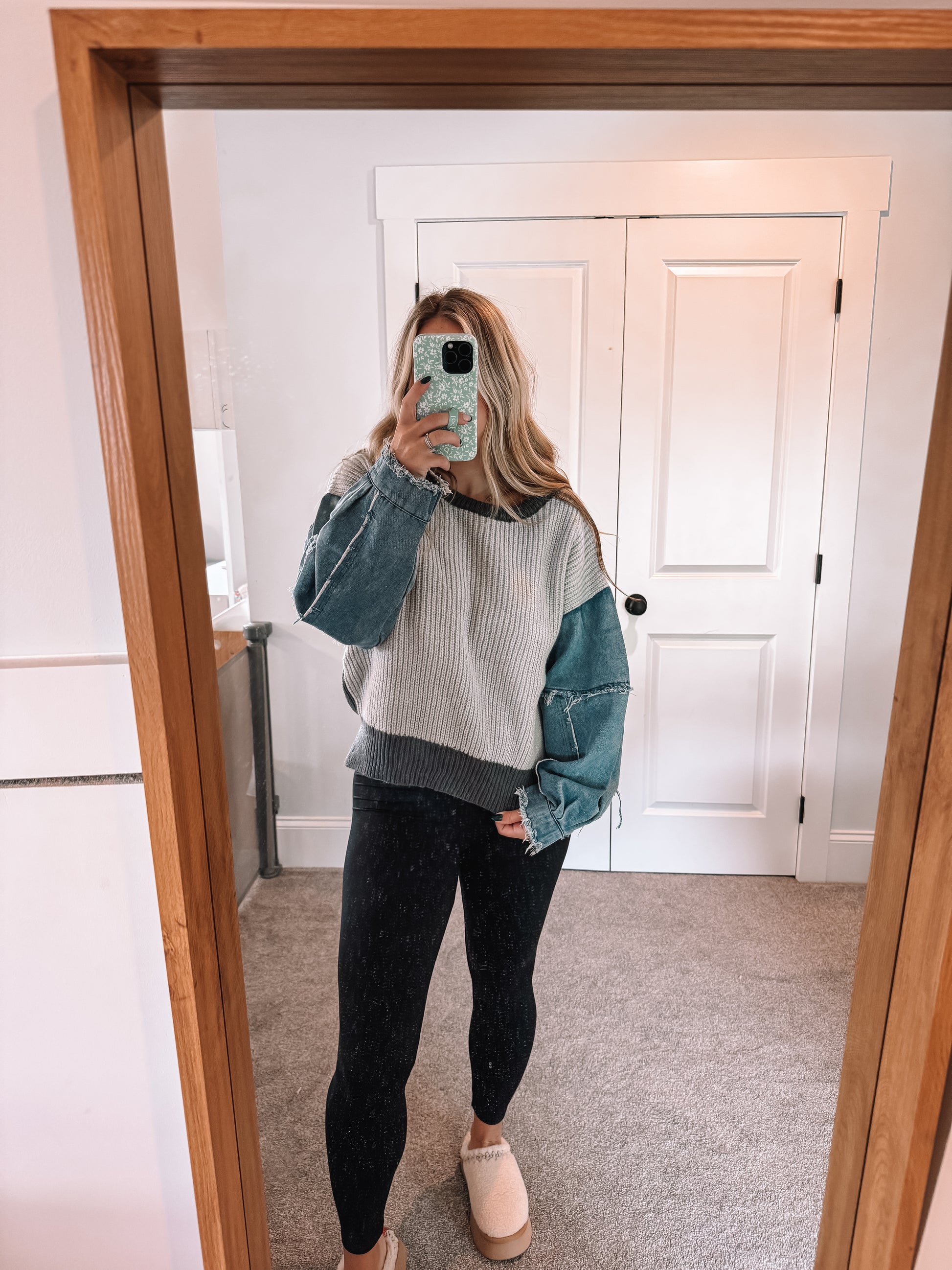 Our Davie Top is a mineral washed sweater top with the denim sleeves giving it an elevated look. Perfect to bring into fall dressed down with some leggings or paired with your favorite denim. Wearing a size small for reference.