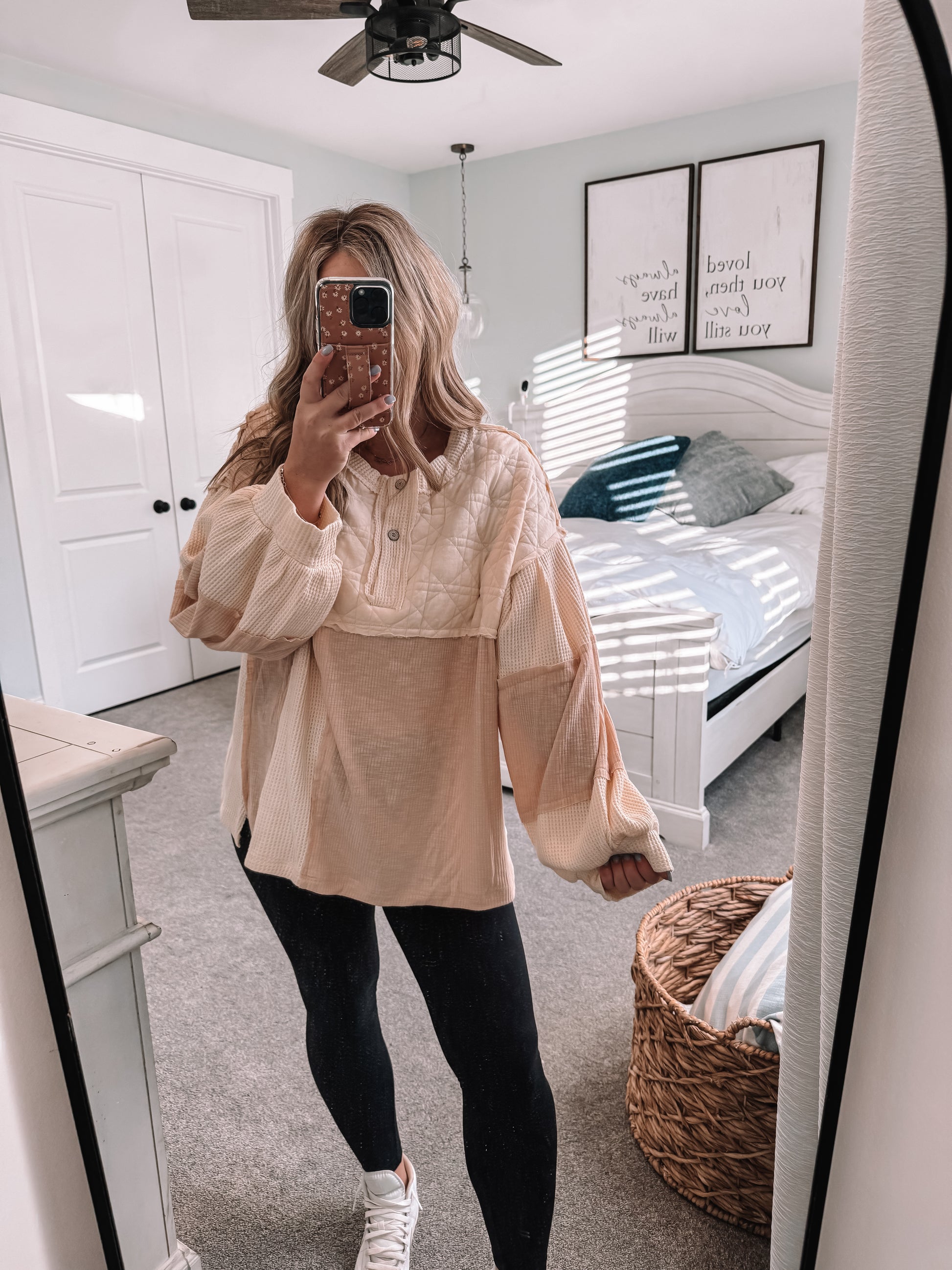 Our Delanie top is an oversized thermal top with quilting contrast. An elevated top to dress up or down for your everyday wear. The perfect blend of neutral colors. If in between sizes, size down.