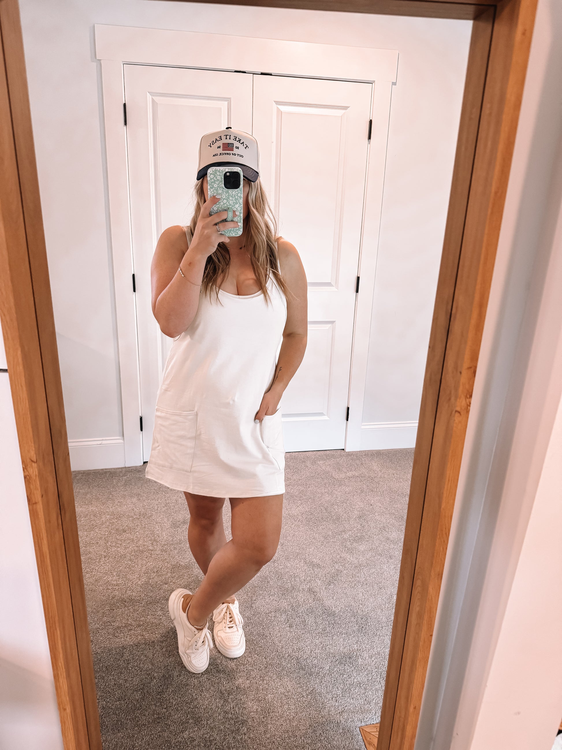 Our Fletcher Romper dress is a comfy dress with a built in romper line and front pocket detail. Adjustable straps and lots of stretch. Wearing a size small. Pair this neutral fit with your favorite sneakers and trucker for perfect everyday wear.