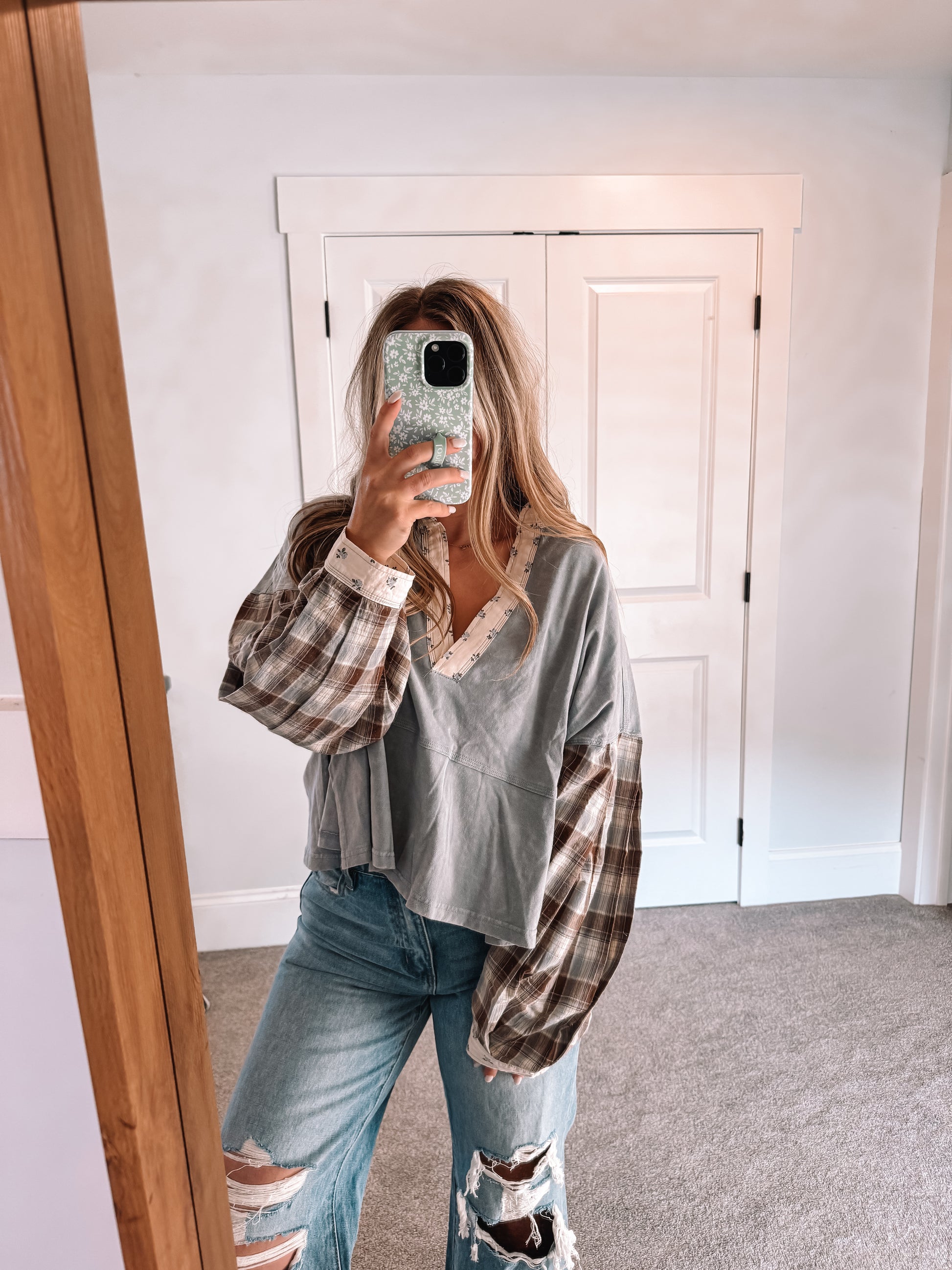 this mixed media top features a mineral washed knit material with plaid balloon sleeves and floral detail along the neckline and cuffs. Wearing a size small for reference.