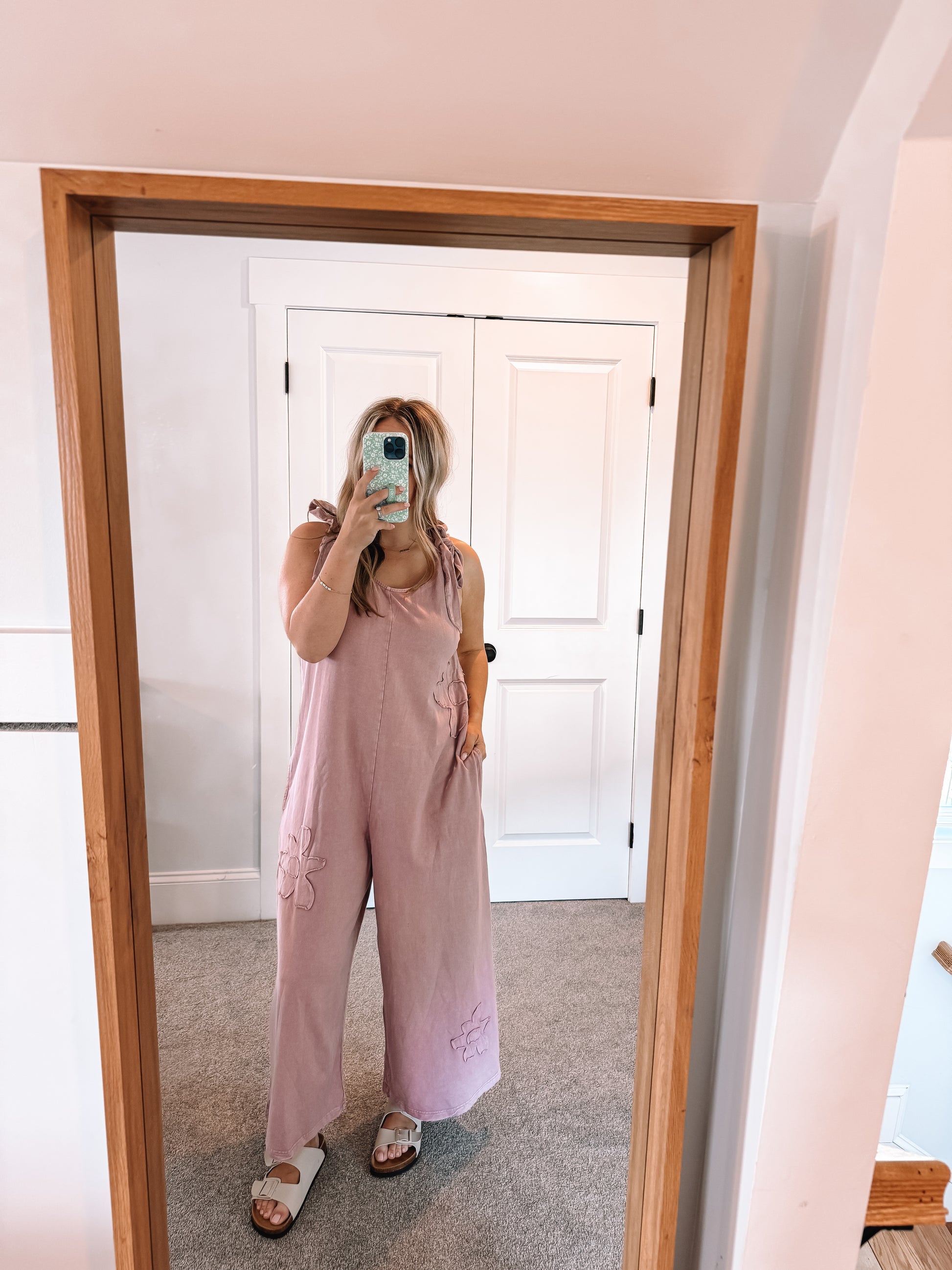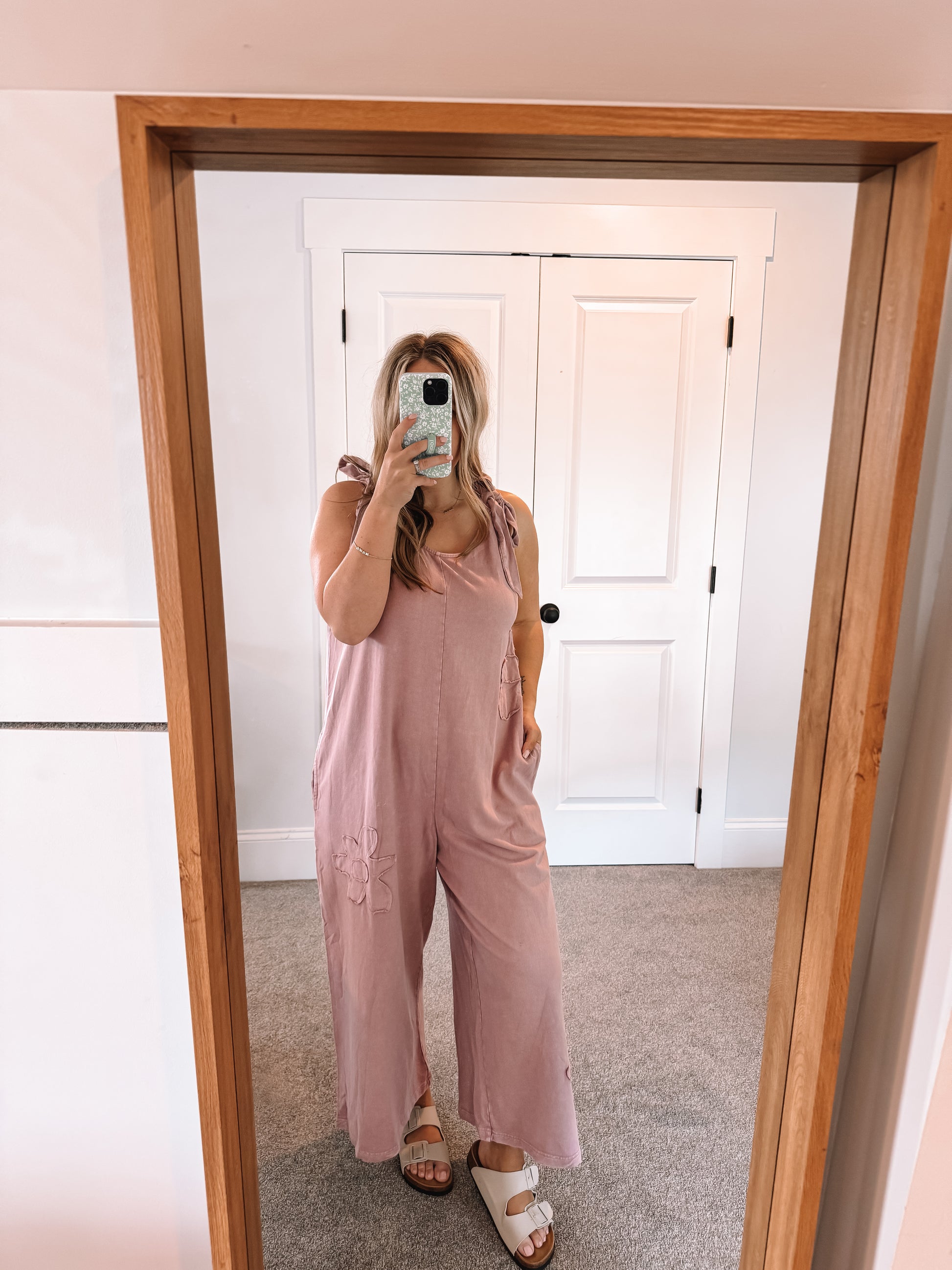Our Freddy wide leg jumpsuit has a floral patchwork detail with adjustable tie straps, side and back pockets featuring a relaxed, loose fit. Wearing a size small, if in between size down.