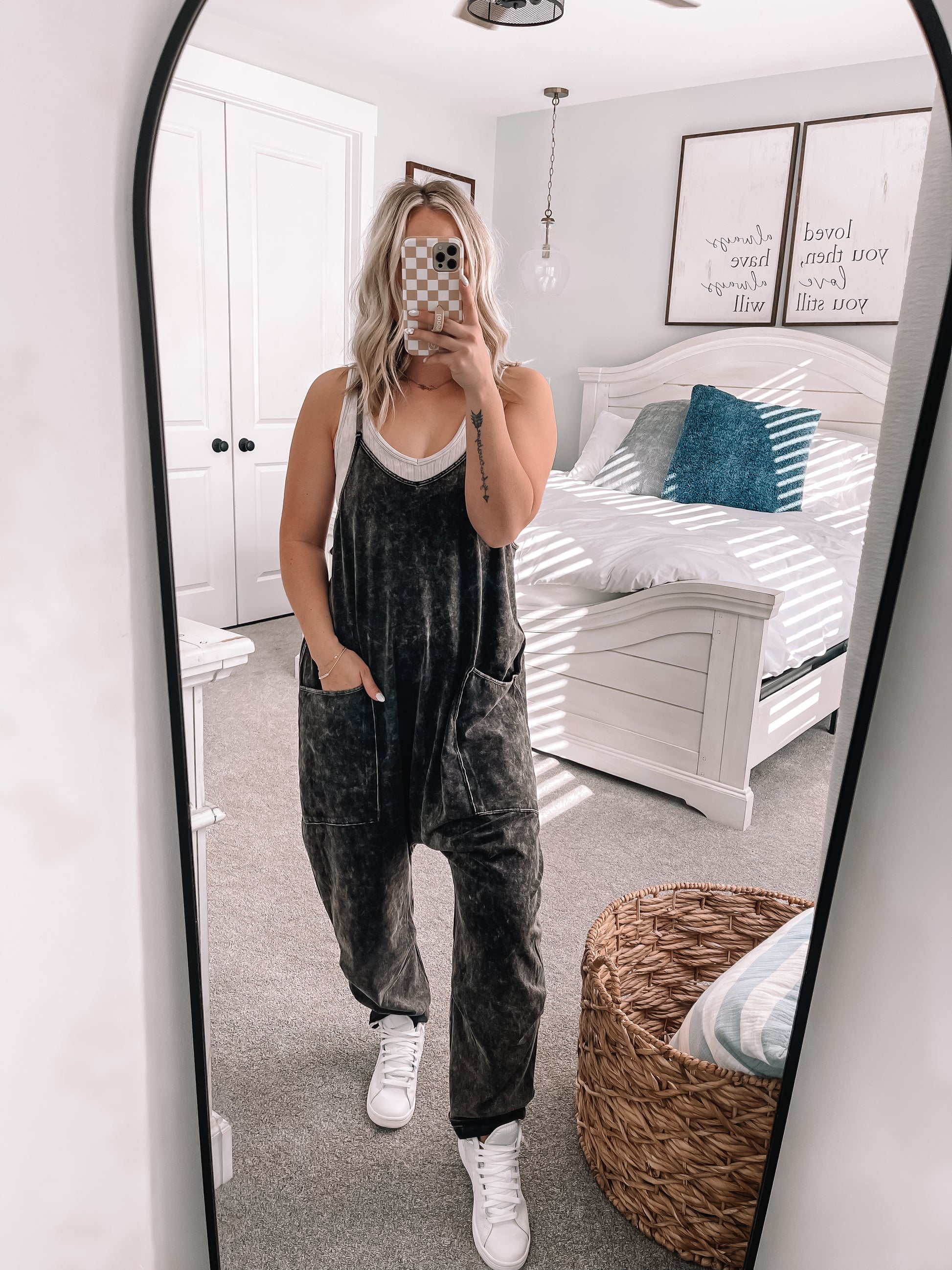 our Grab and Go jumpsuit is effortlessly stylish and practical, must-have staple for your closet. The wide-leg design allows for comfort and ease of movement and also has a zipper pocket detail on the back. With a spaghetti strap and front pocket detail, this 18-inch inseam jumpsuit is a closet staple for everyday wear and easy to dress up or down.