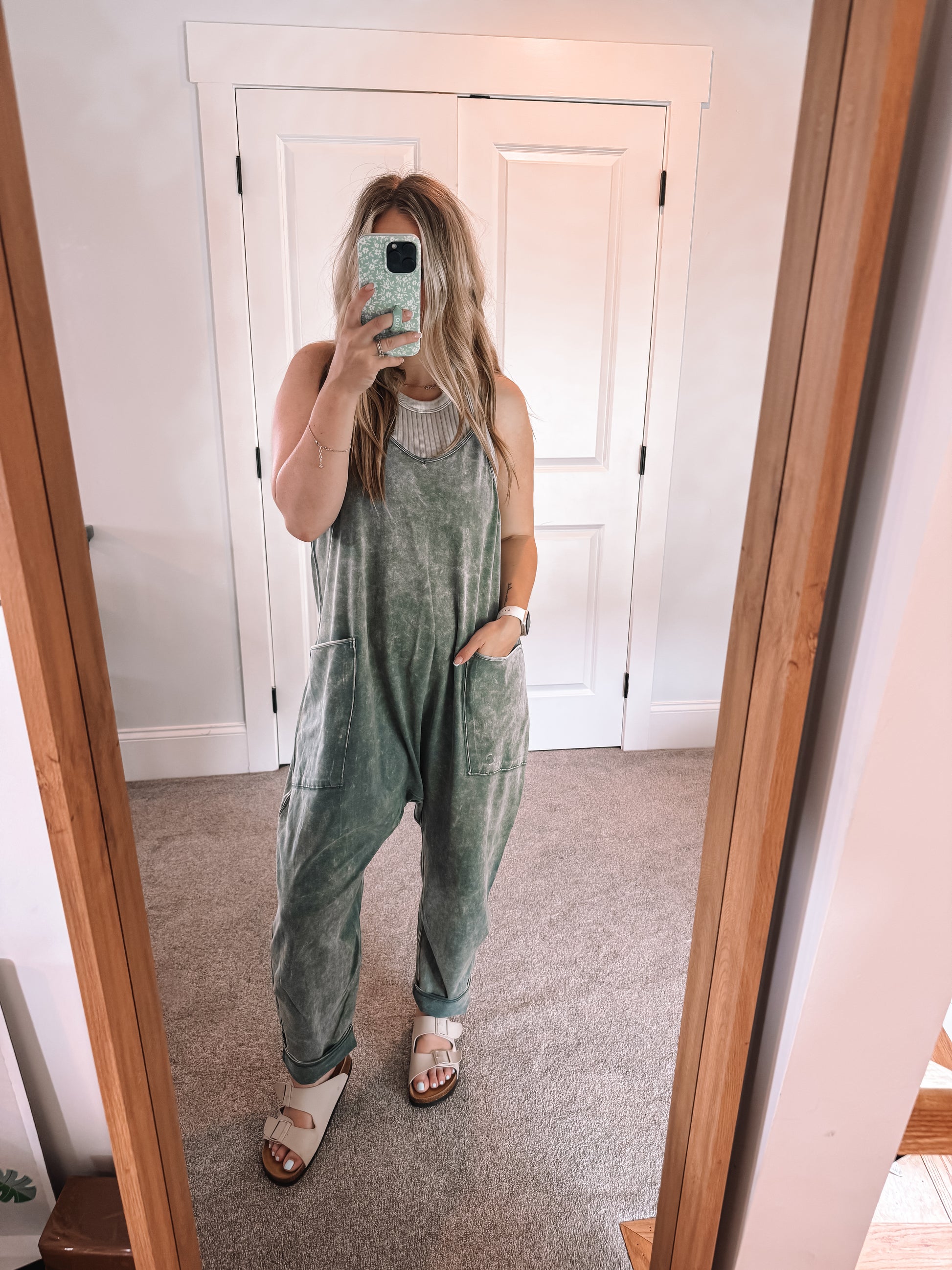 our Grab and Go jumpsuit is effortlessly stylish and practical, must-have staple for your closet. The wide-leg design allows for comfort and ease of movement and also has a zipper pocket detail on the back. With a spaghetti strap and front pocket detail, this 18-inch inseam jumpsuit is a closet staple for everyday wear and easy to dress up or down.