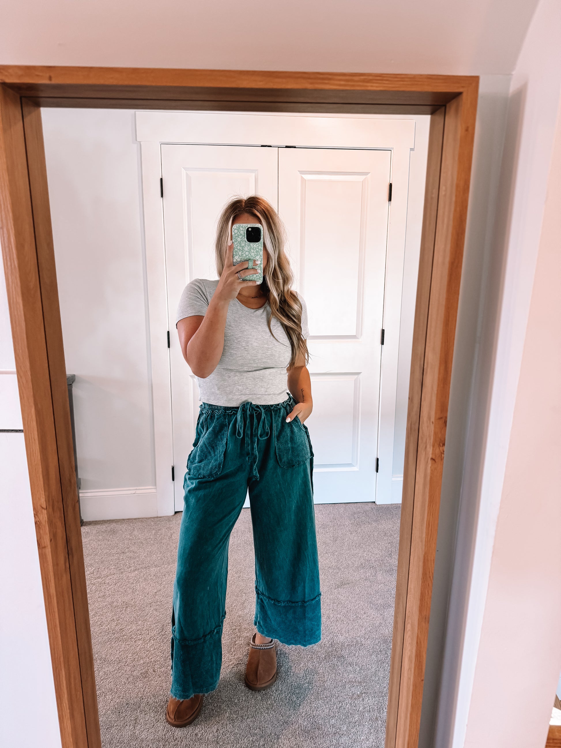 Our Hunter wide leg pants are mineral washed with raw hem edged details. Functional pockets, elastic waistband with tie. A fall staple to dress up or down depending on occasion. Wearing a size small for reference.