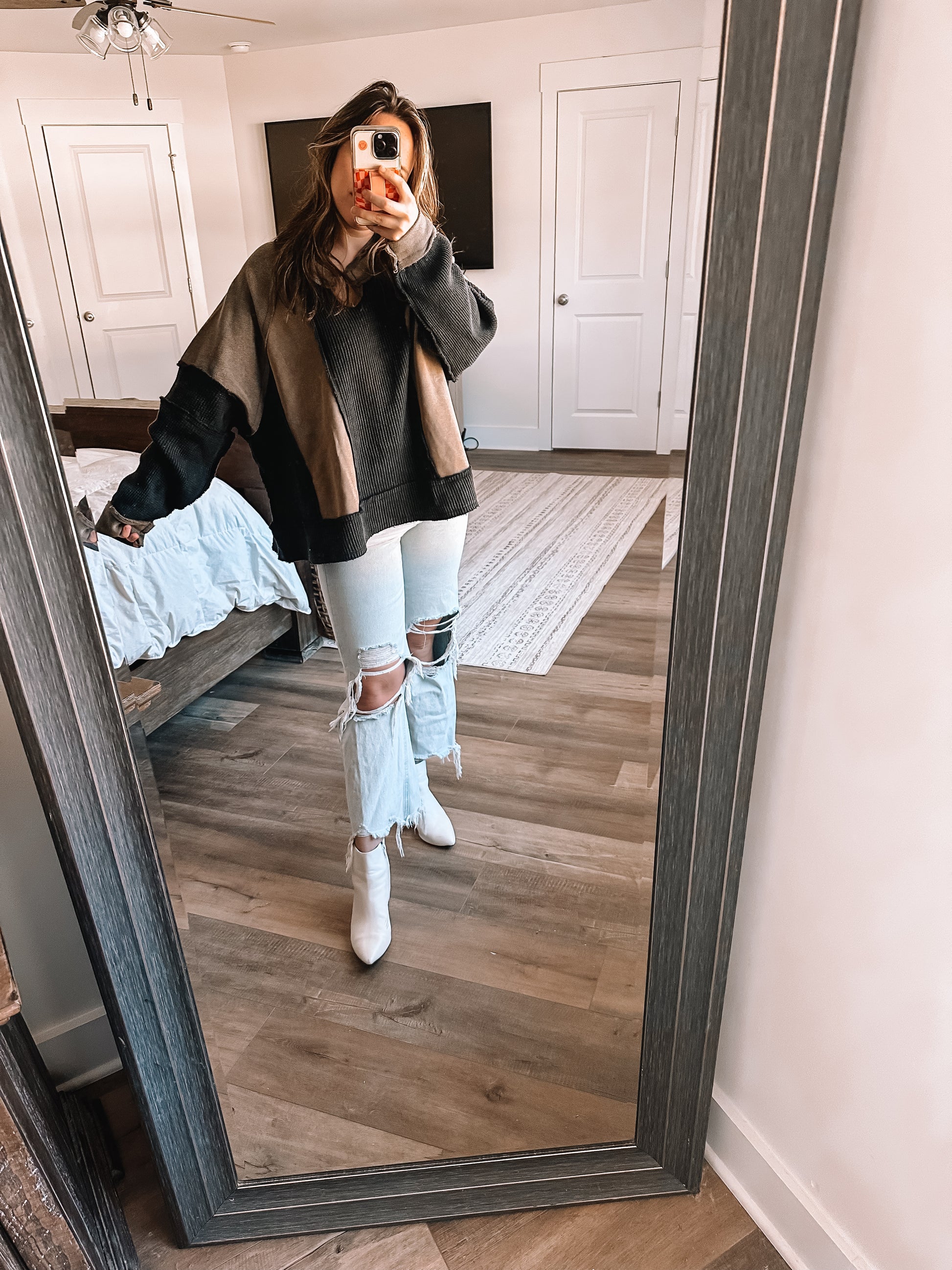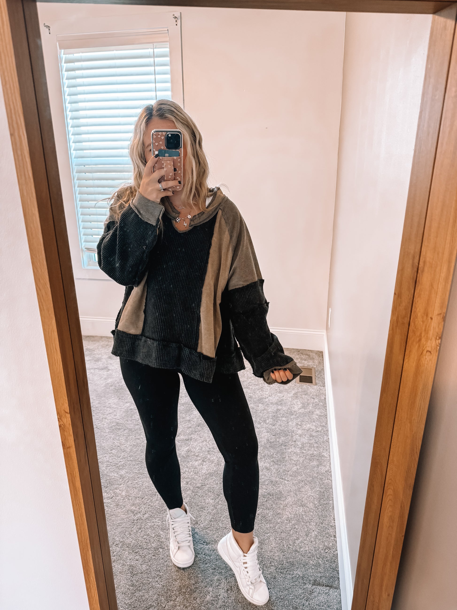 Our Kameron Pullover will be one of your favorite grabs all year round. the notched neck and contrast fabrics calls for a staple piece in your wardrobe. This style can be dressed up for a girls night out or a night in. Oversized fit. Can play with sizing but safe to stick true to size.