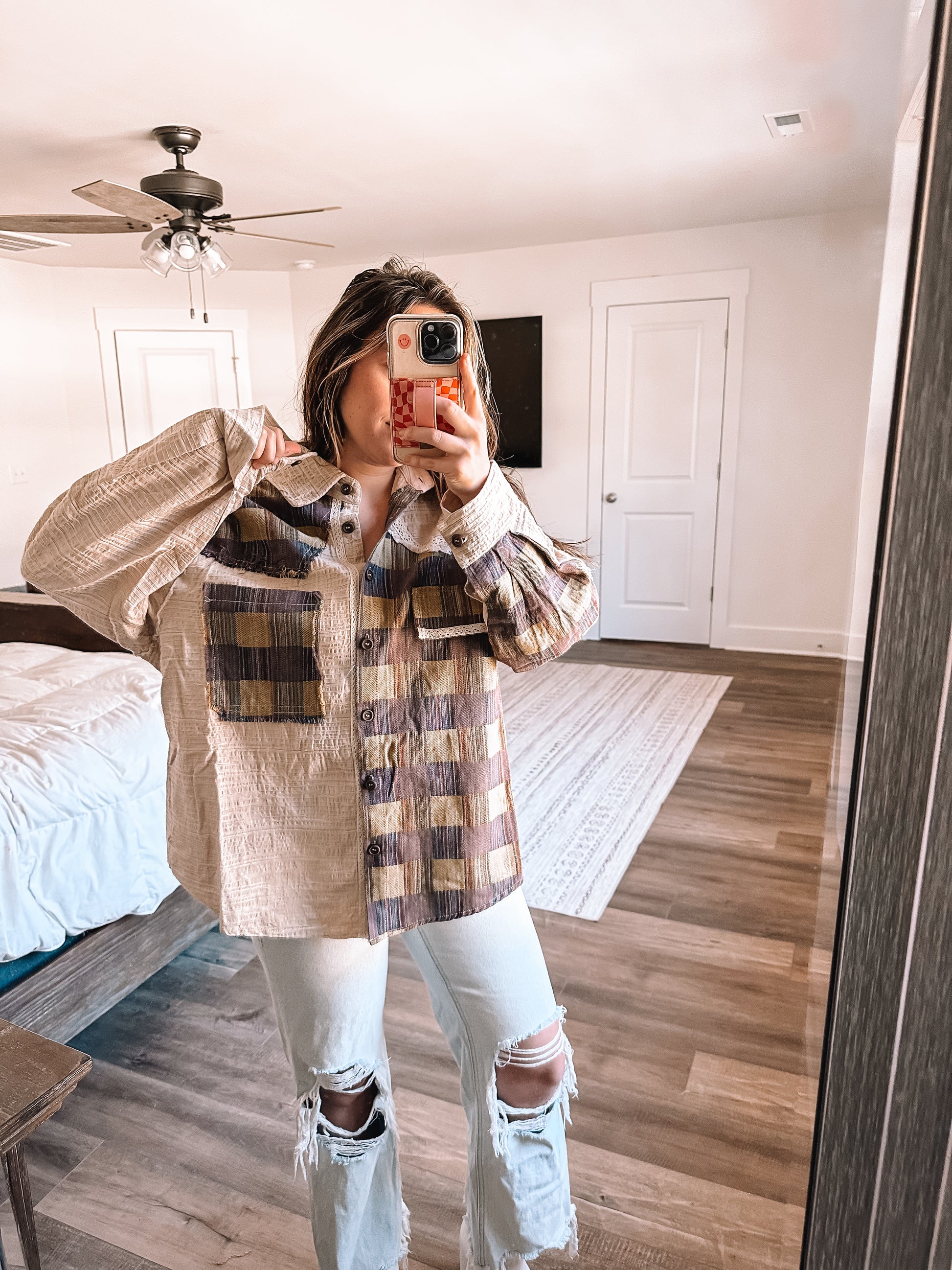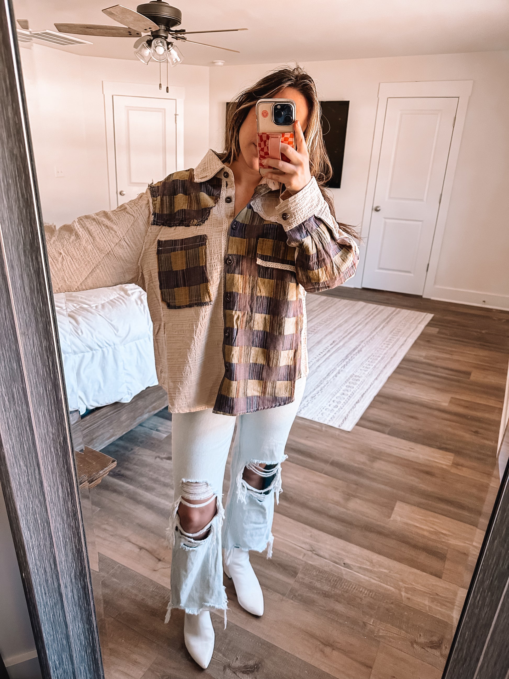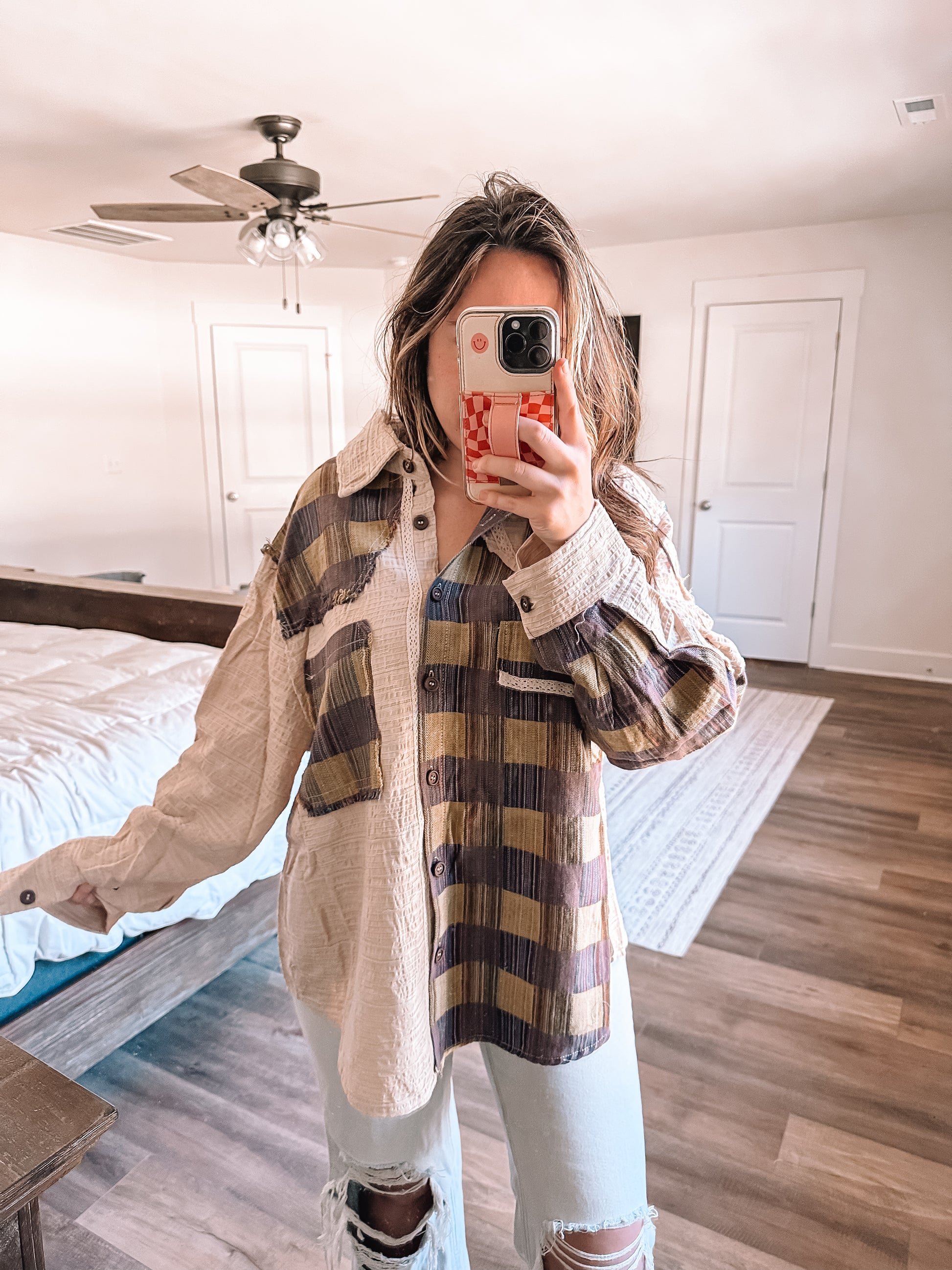This fun textured woven plaid button down is a unique contrast of colors and screams fall. Dress down with your favorite pair of comfy leggings and sneakers or wear out dressed up with denim and booties. Oversized fit.