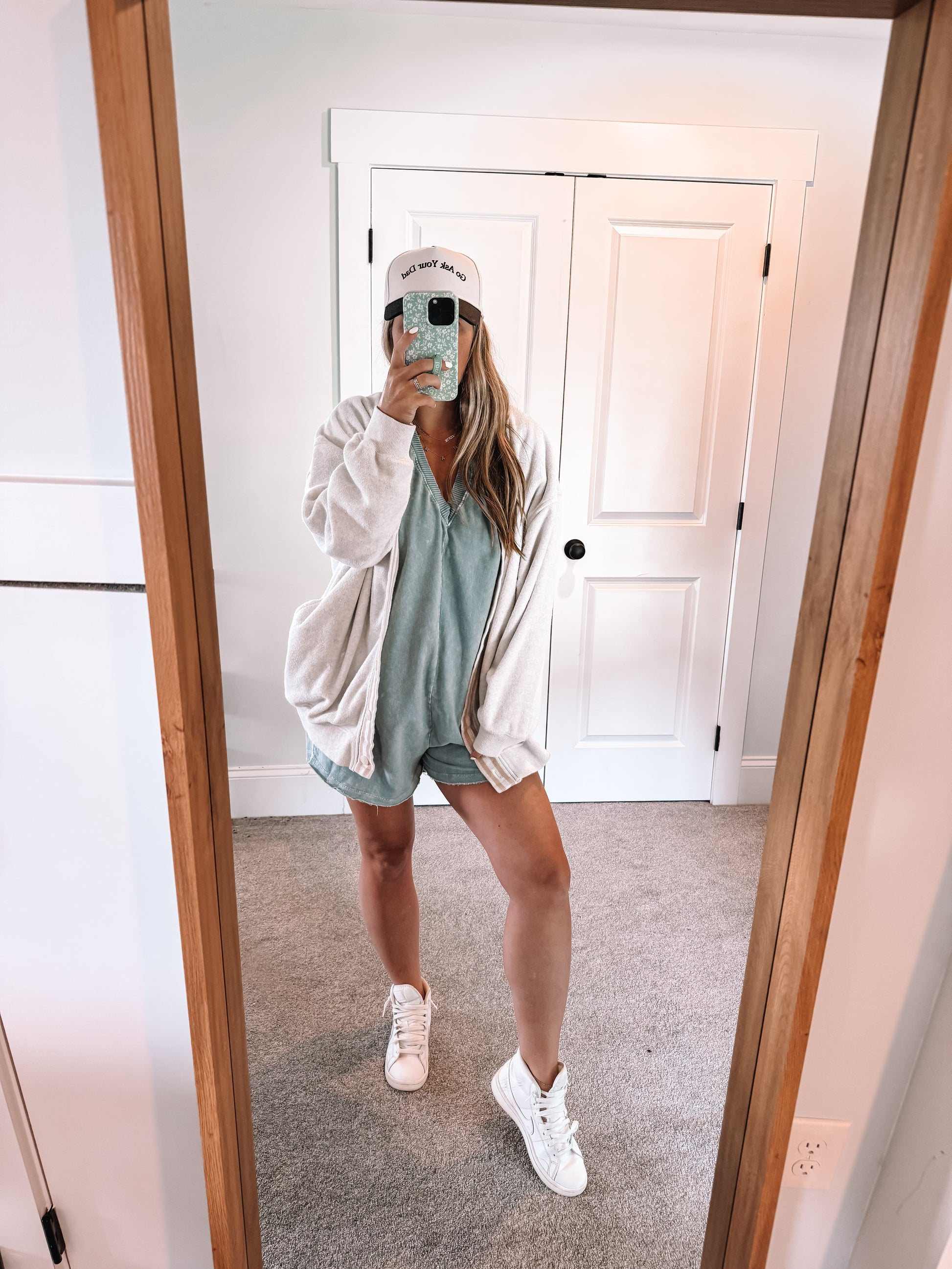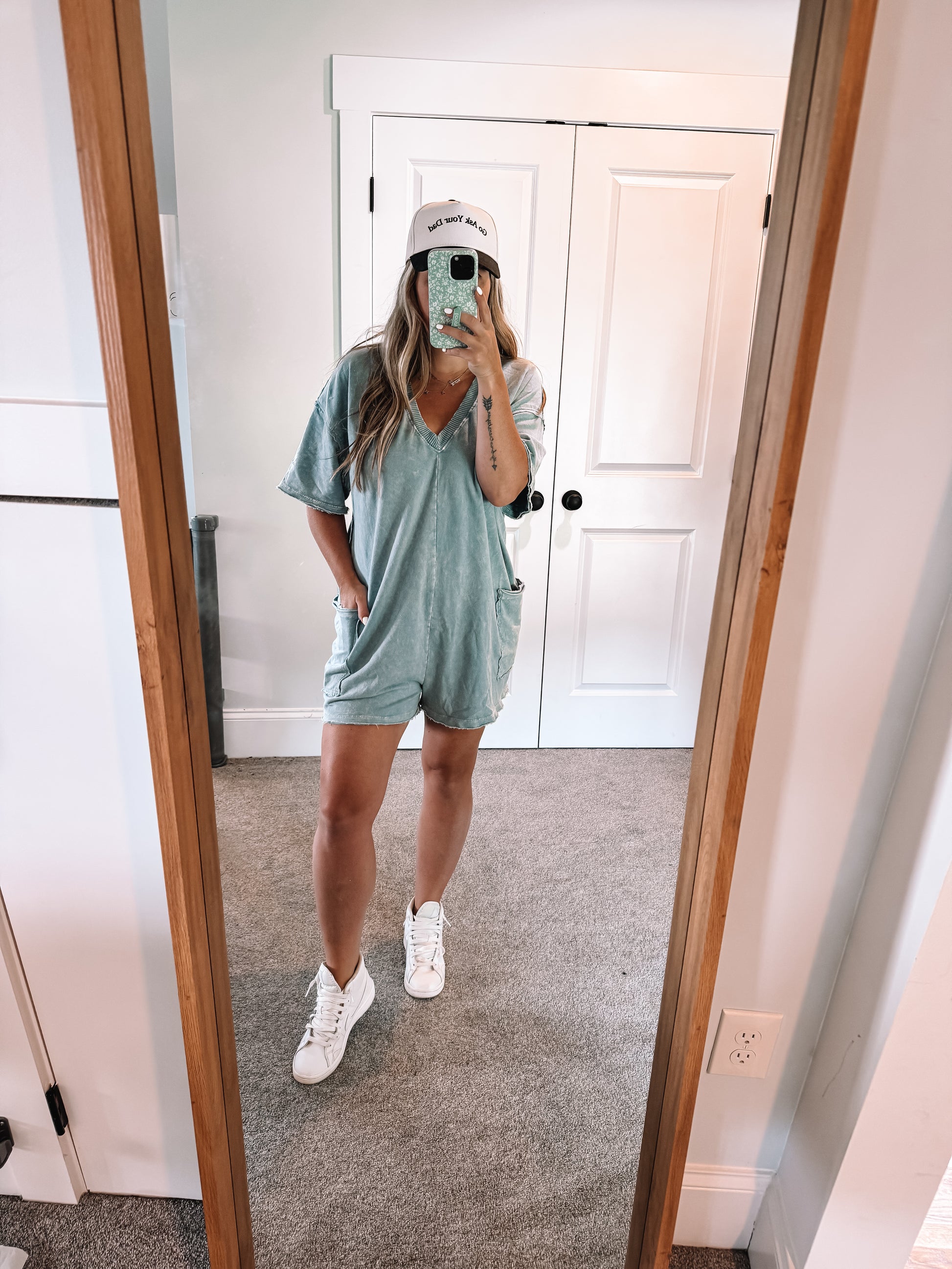 Our Maddy romper is a comfy oversized fit with functional pockets and a versatile piece to dress up or down or layer going into the cooler months. If in between sizes, size down. Wearing a size small for reference.