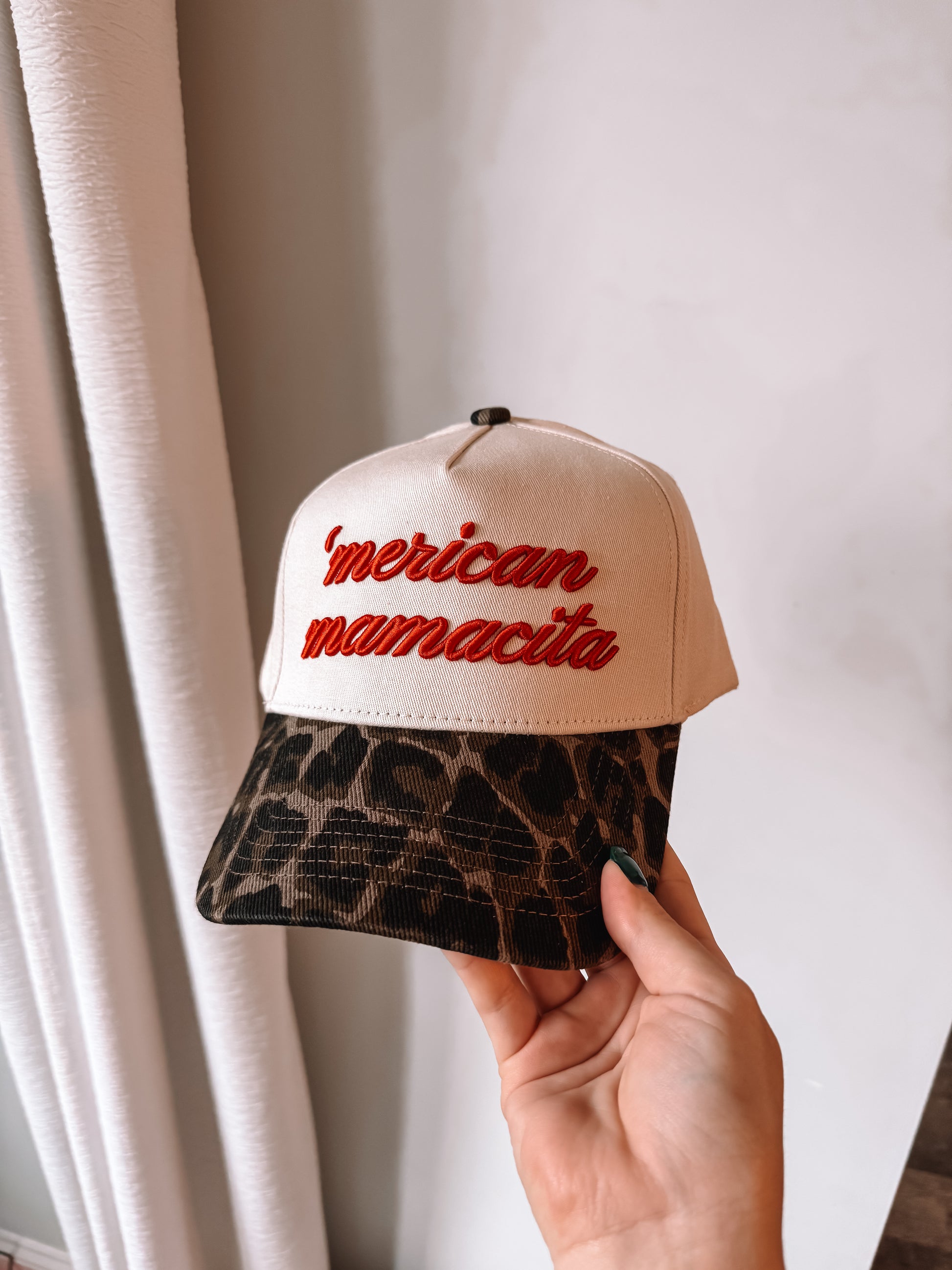 Embroidered, adjustable snapback. Cream, red and cheetah combo.