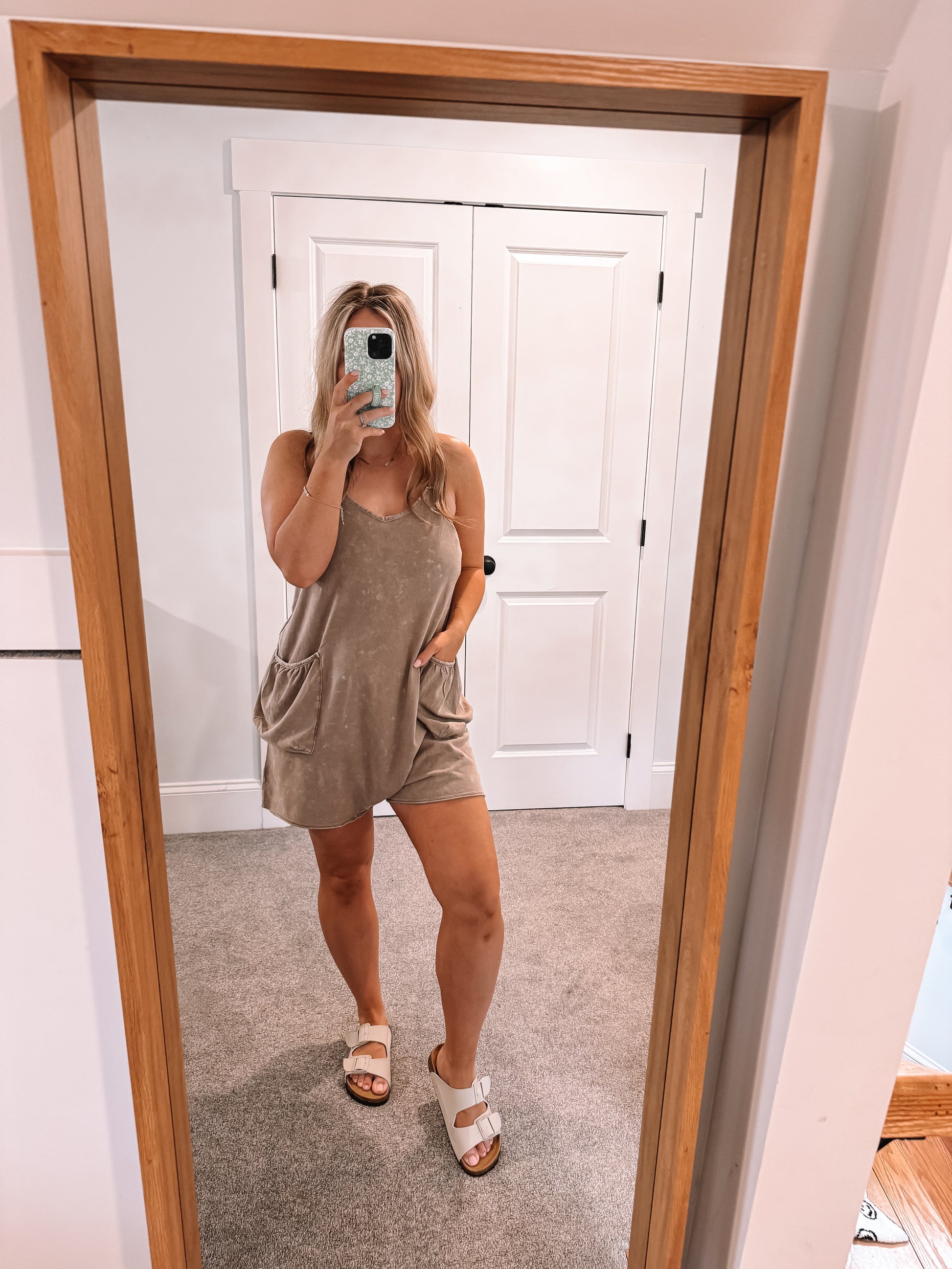 Our Molly Romper is a mineral washed sleeveless knit romper with pockets and adjustable straps. Oversized fit, wearing a size small.