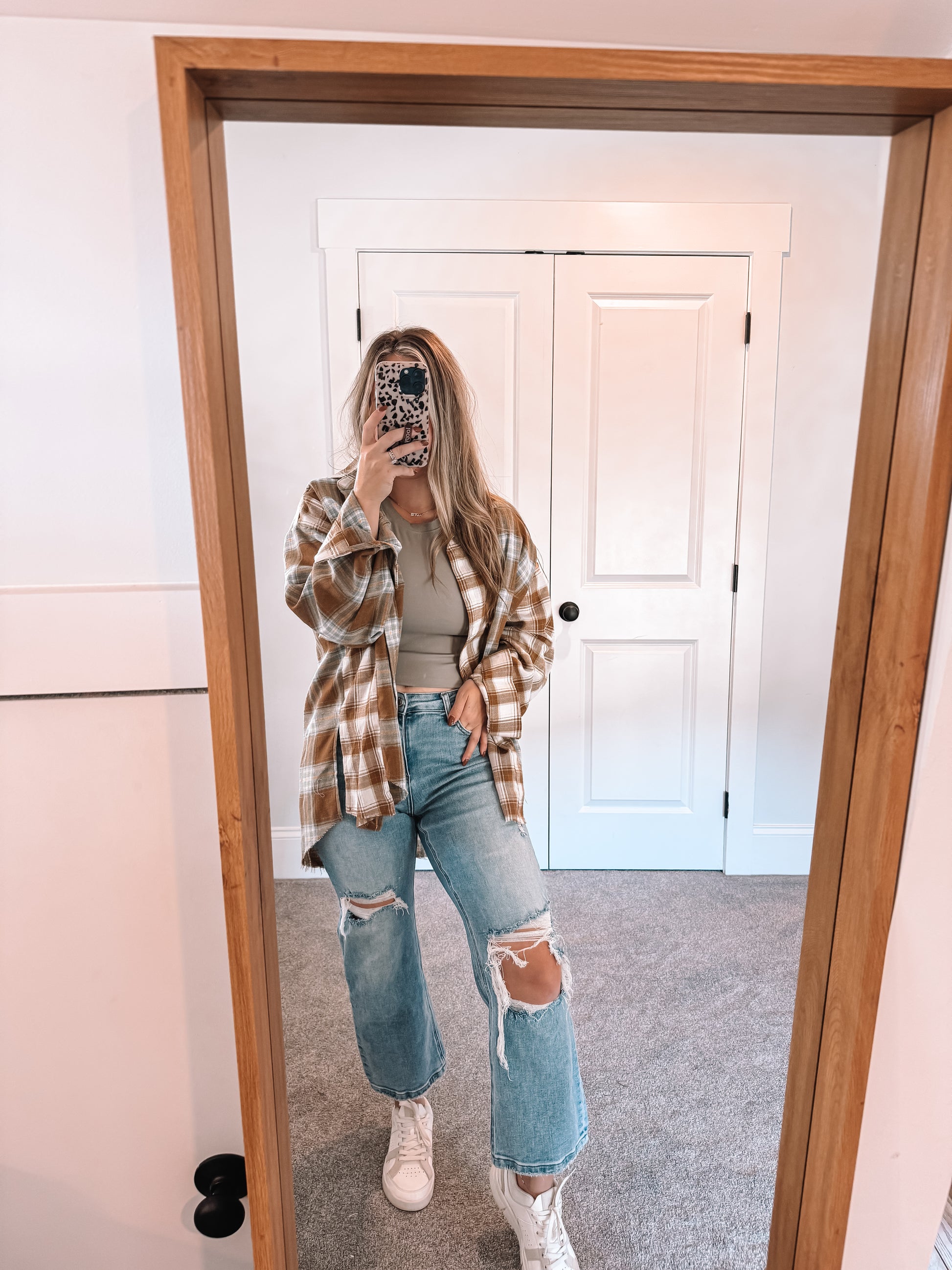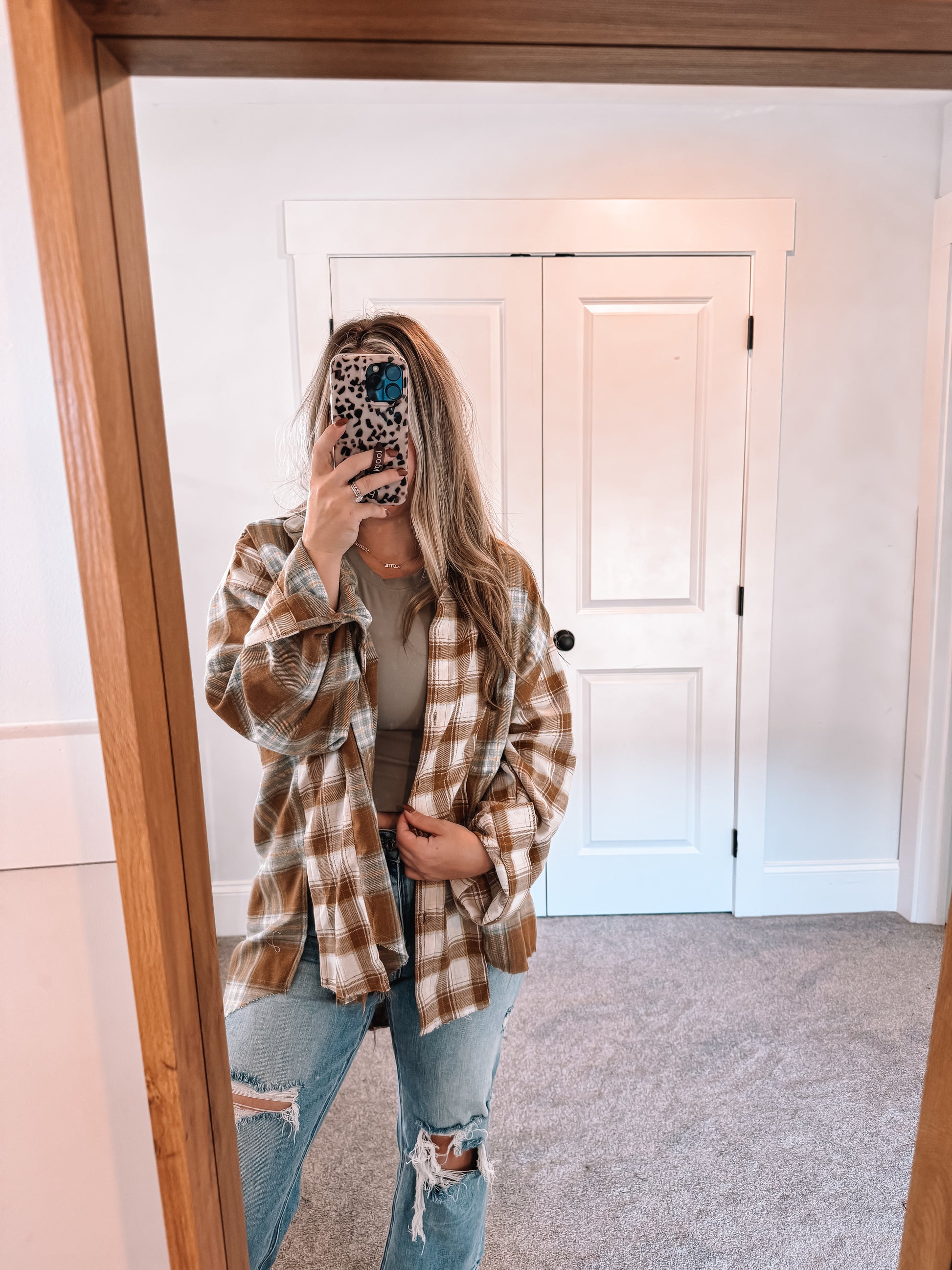 With a mixture of browns, sage and white, there are so many ways to pair our Noelle flannel this season. An oversized fit with an asymmetrical hem we love for the edgy feel. Model is 5'2 wearing a size medium. Can stick true to size in this piece.