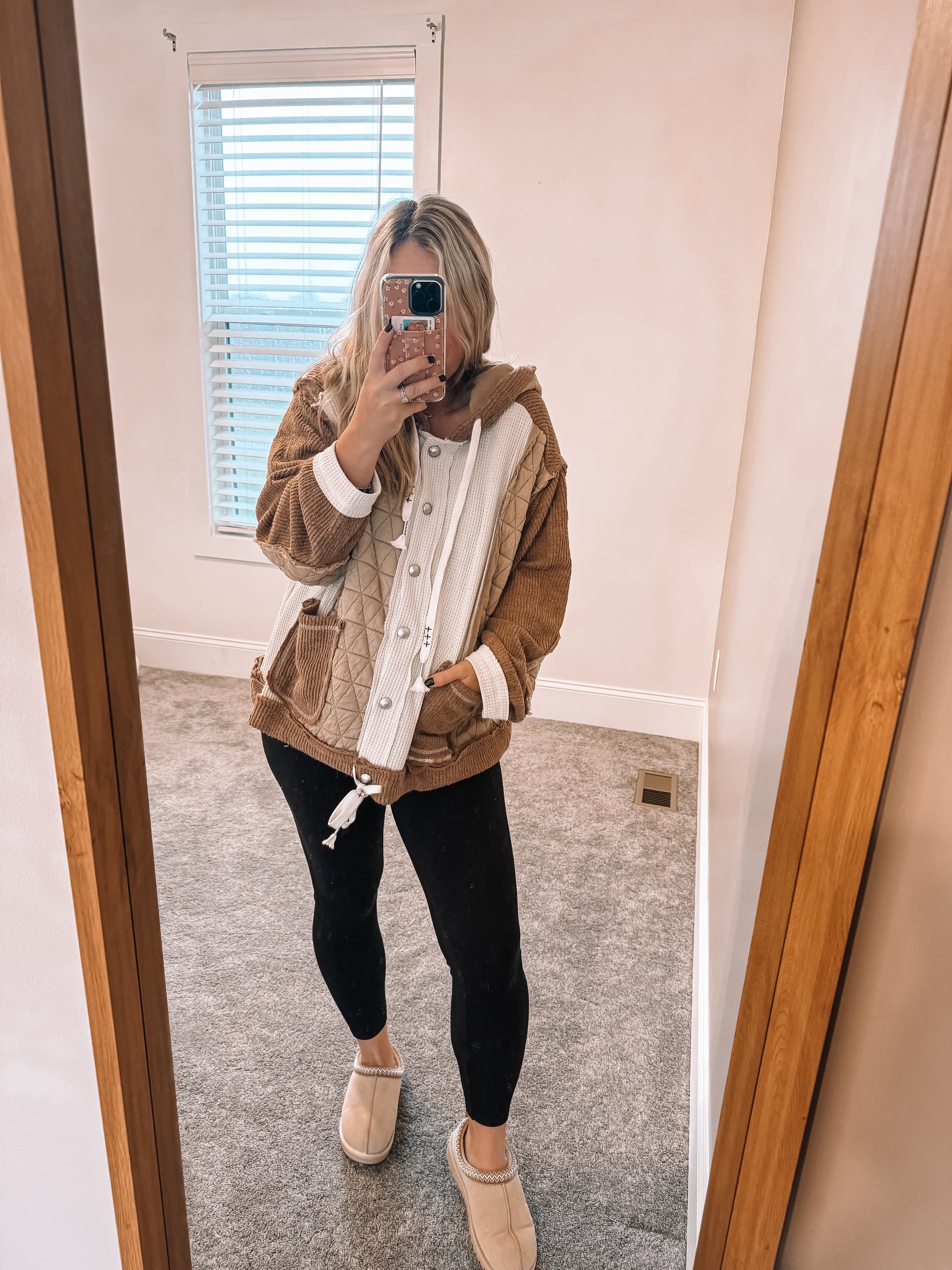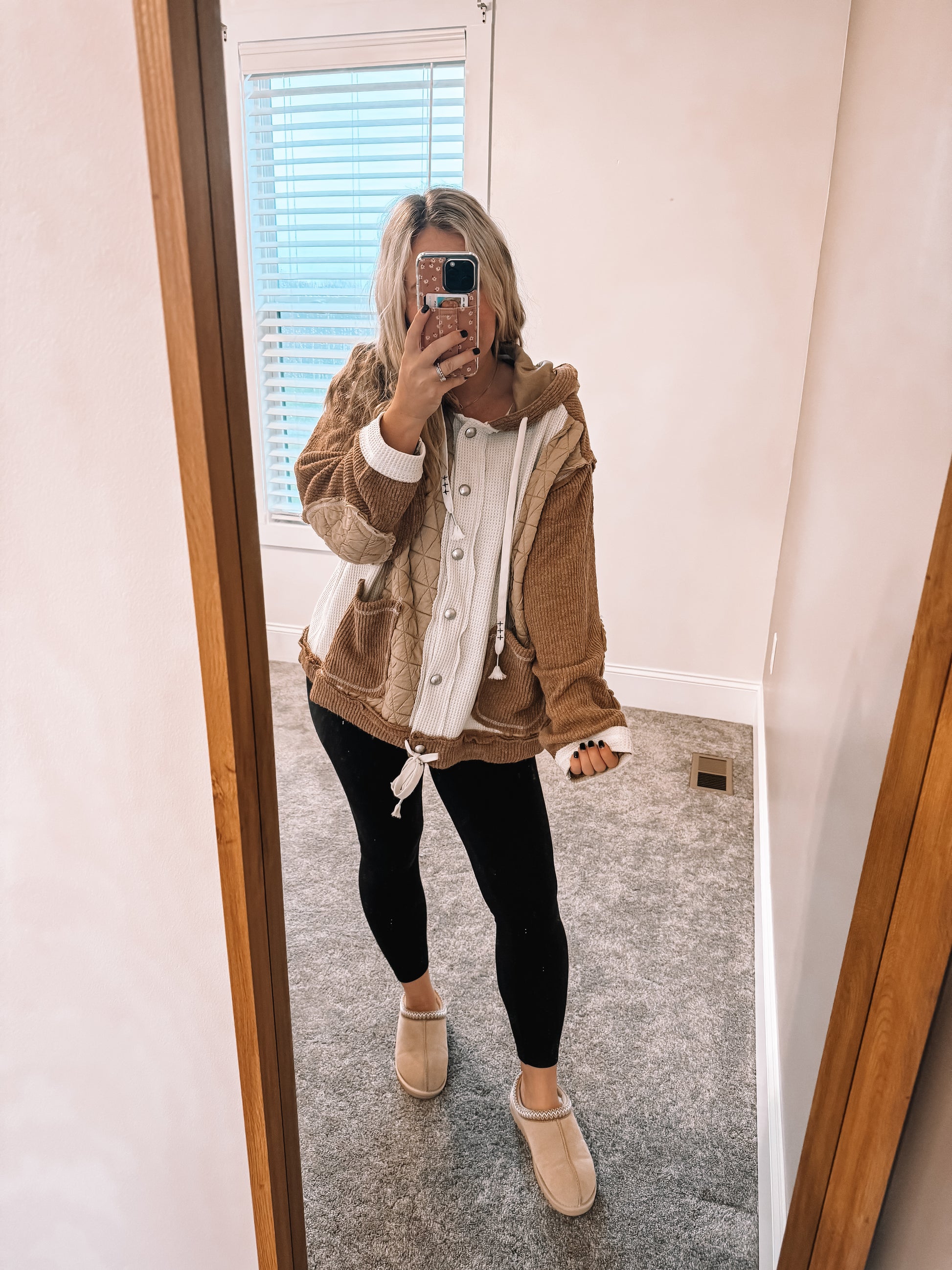 Our Oaklyn Shacket is a must have! This button down is designed to be an oversized fit with hoodie featured in thermal, quilted knit. Such a fun and unique piece to dress up or have for everyday wear.
