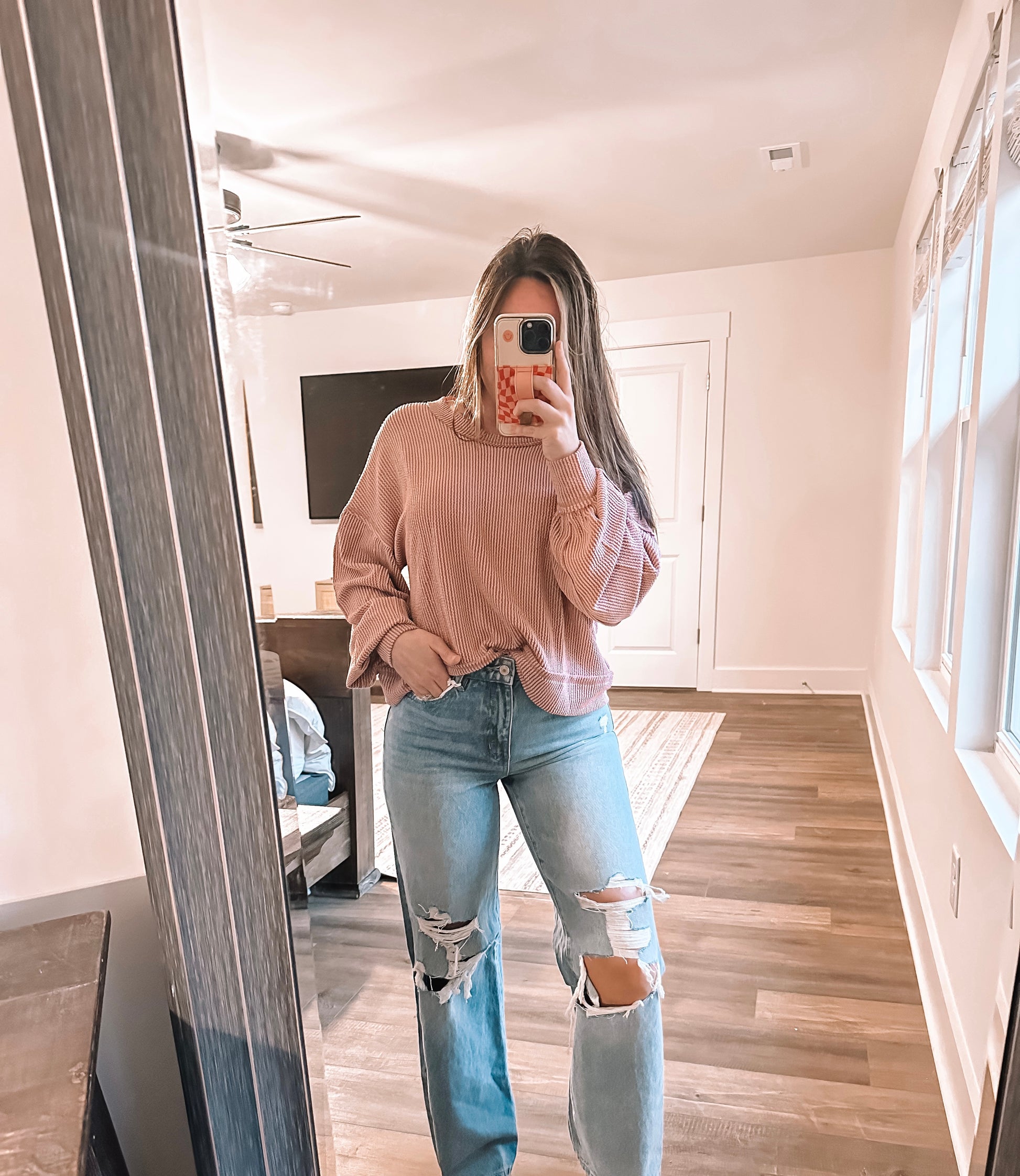 Our Otto knit top is the perfect everyday basic to grab and go - even layer. Ribbed texture with a loose oversize fit and cute patch detail on the back. Model is wearing a size small.