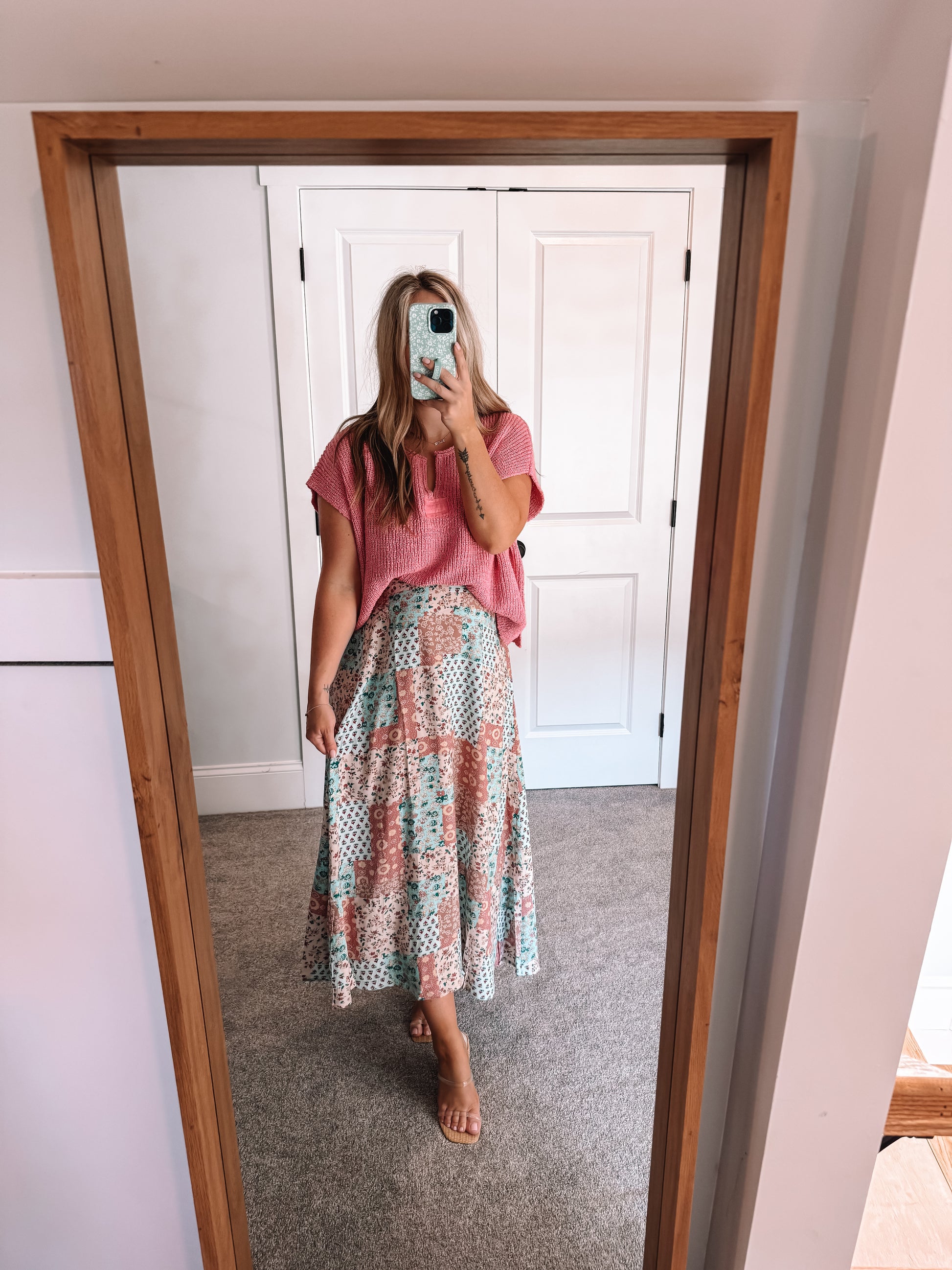 Our patchwork midi skirt is the perfect versatile piece to dress up or down for any occasion. Elastic band in the back giving it a loose comfortable fit. Wearing a size small for reference and a great transition piece into spring.