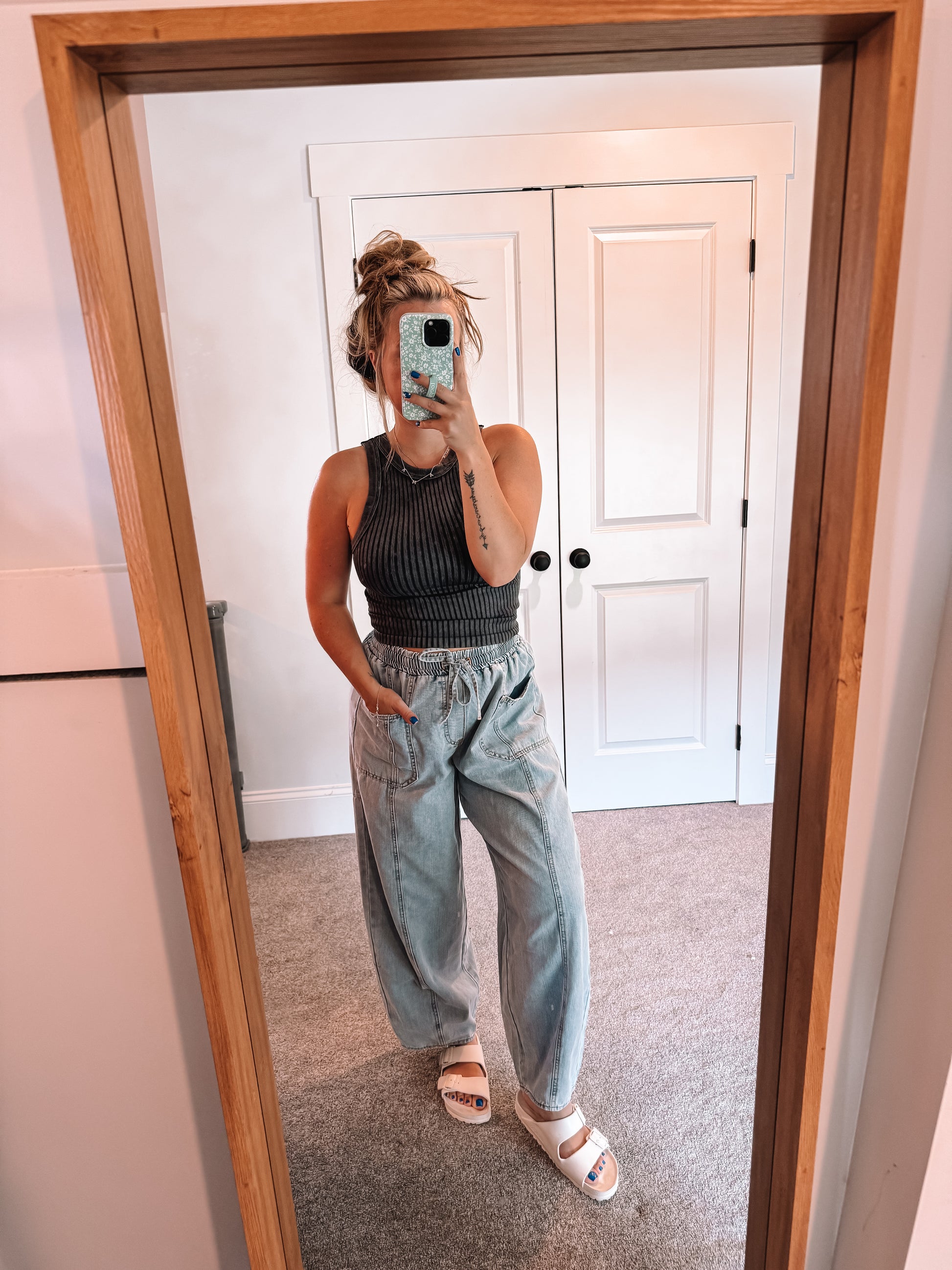 round neck ribbed material with lots of stretch. Wearing a S/M for reference. Perfect layering piece all year round!