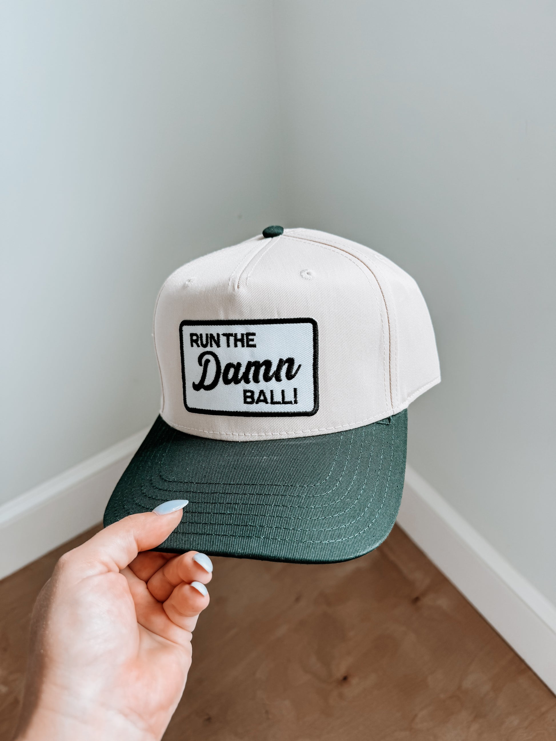 Our the Run The Damn Ball Trucker hat, perfect for game day with a football-inspired design and easy to dress up or down.