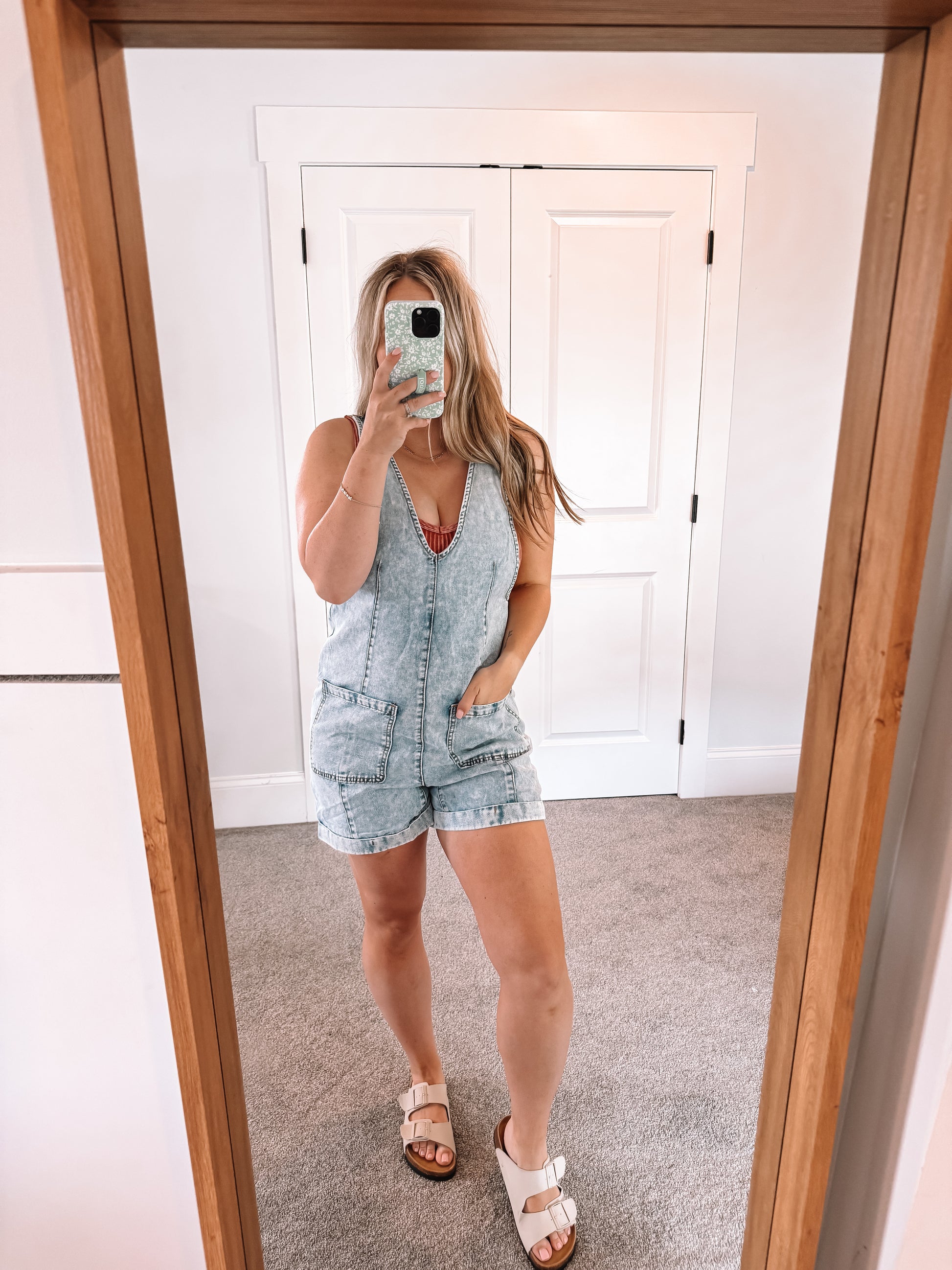 Our Denim Romper is a sleeveless casual look with front pockets, roll up hem and adjustable straps. Wearing a size small.