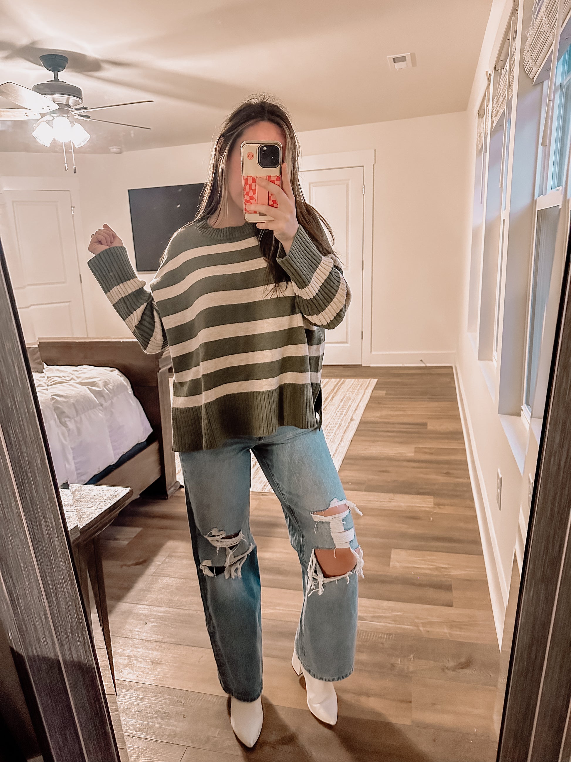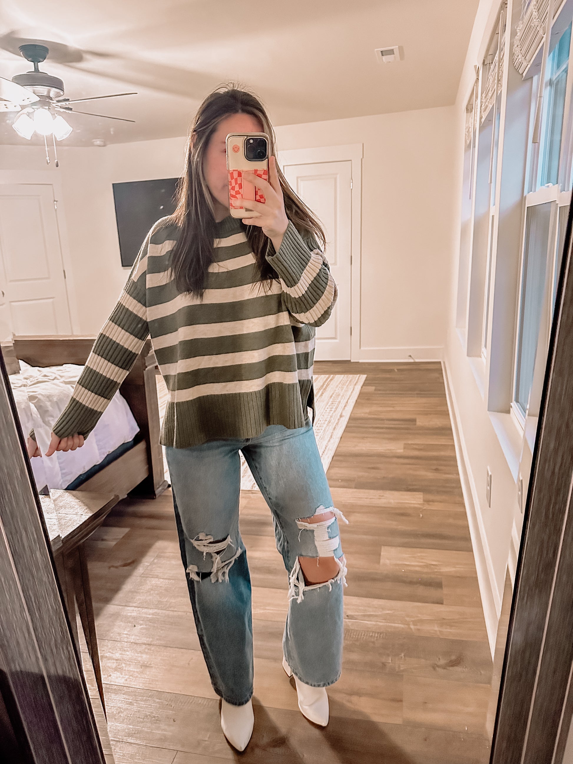 Stay cozy with the Teagan Sweater. This striped knit is perfect for any occasion, with a ribbed round neck and long sleeves for added warmth. Plus, the side slit detail adds a unique touch to this closet staple. Sweater weather never looked so good! Model is wearing a size S/M.