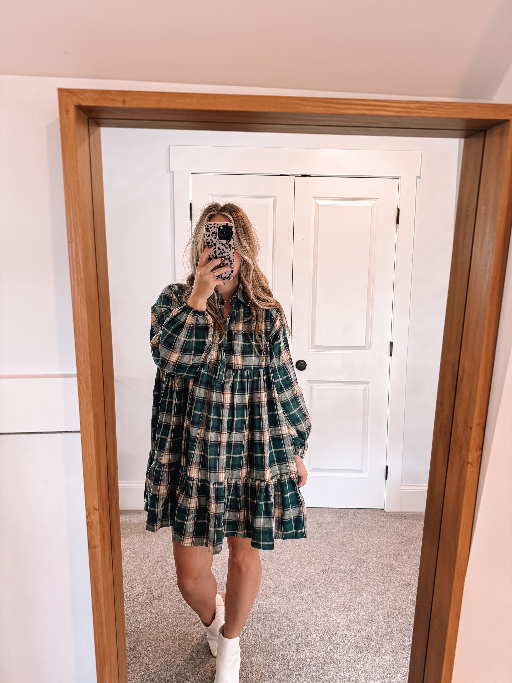 Our tiered plaid hunter green dress is the perfect look for family photos this season. Loose fit, with side pocket. Dress up with a neutral bootie or wear casual with a sneaker. Wearing a size small for reference.
