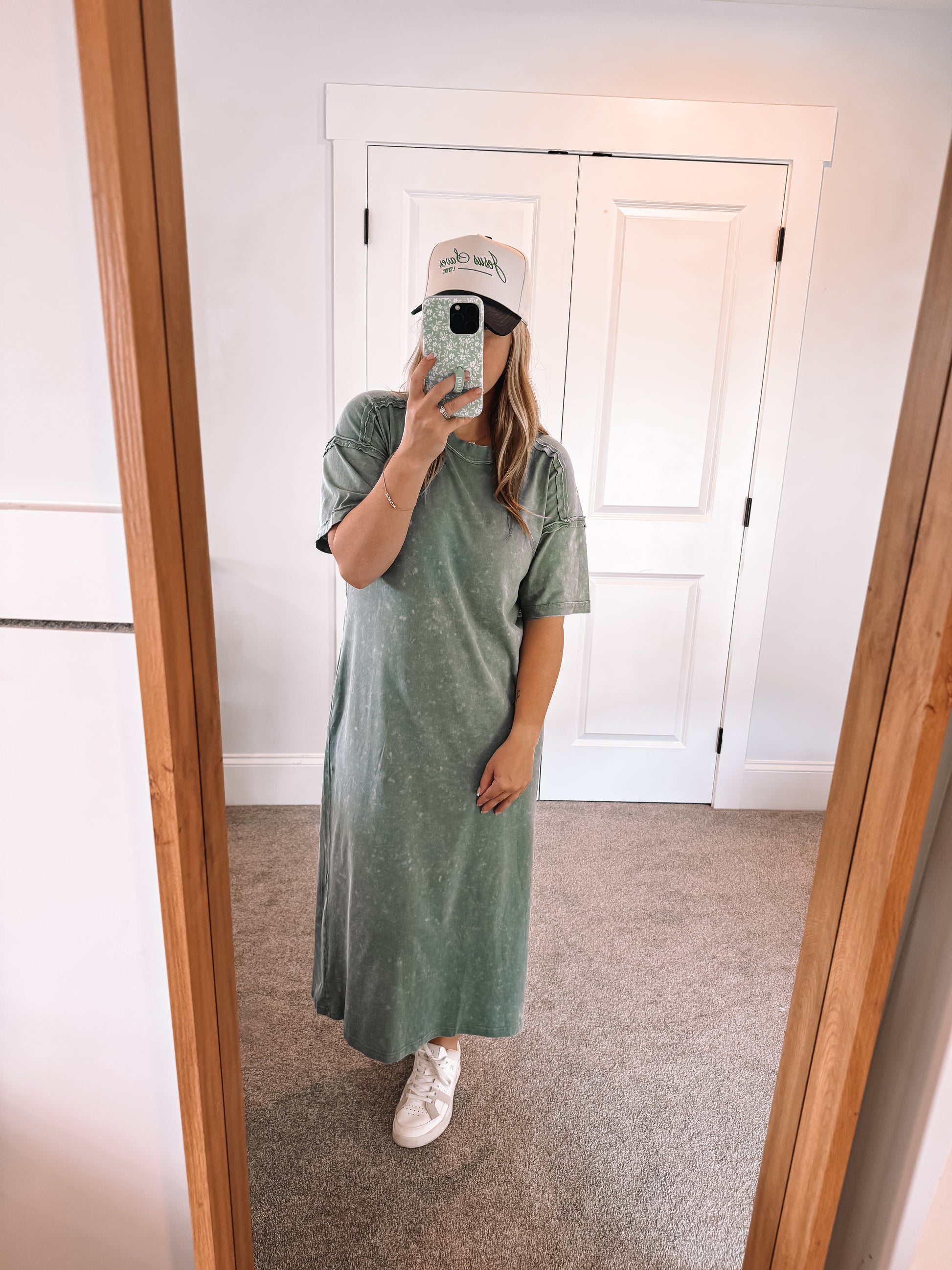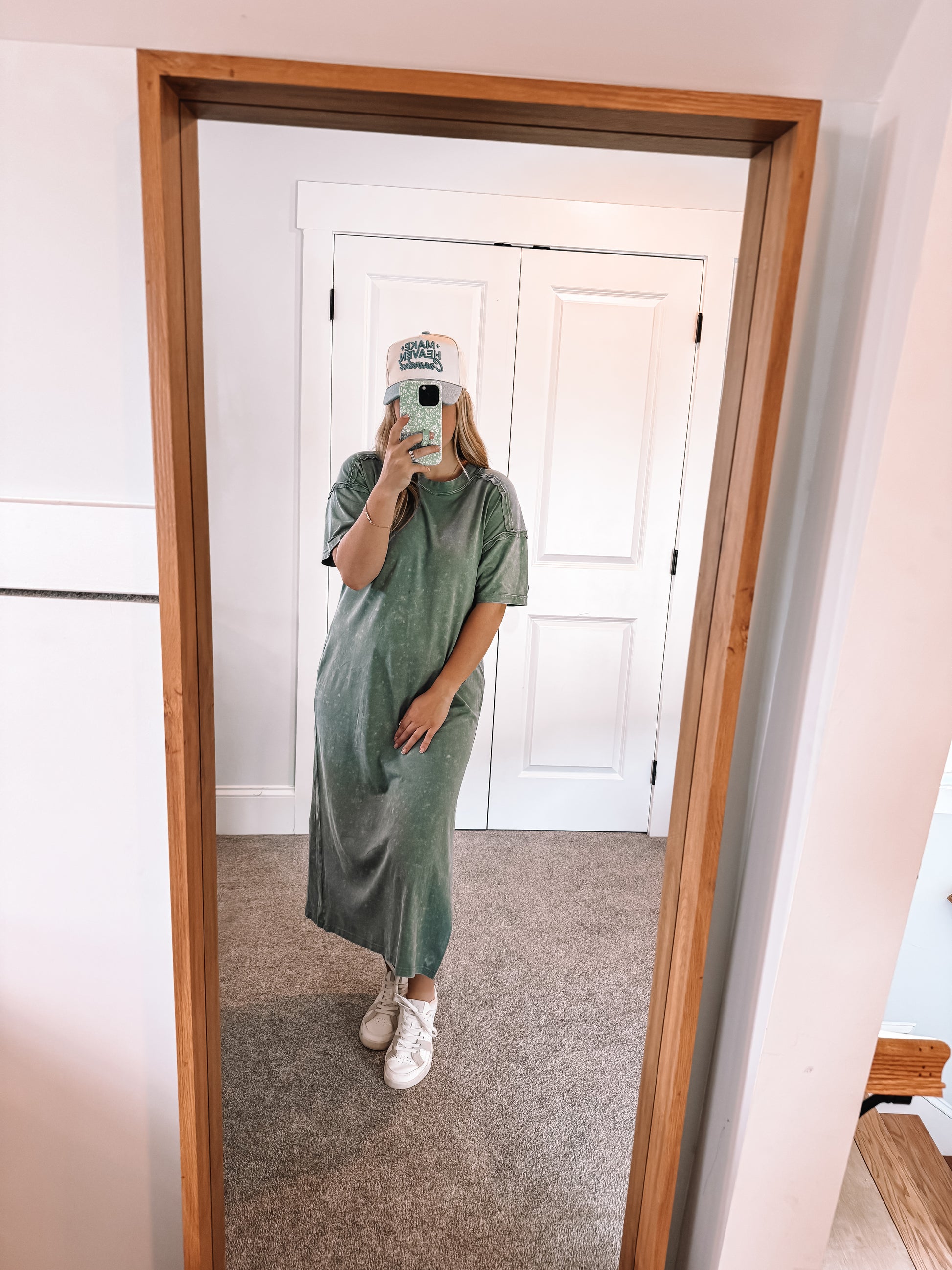 Our Tshirt midi is a mineral wash causal and comfy fit for everyday wear. Oversized fit with side slit detail. Wearing a size small for reference. Easily accessorize this piece to dress up or down depending on occasion.