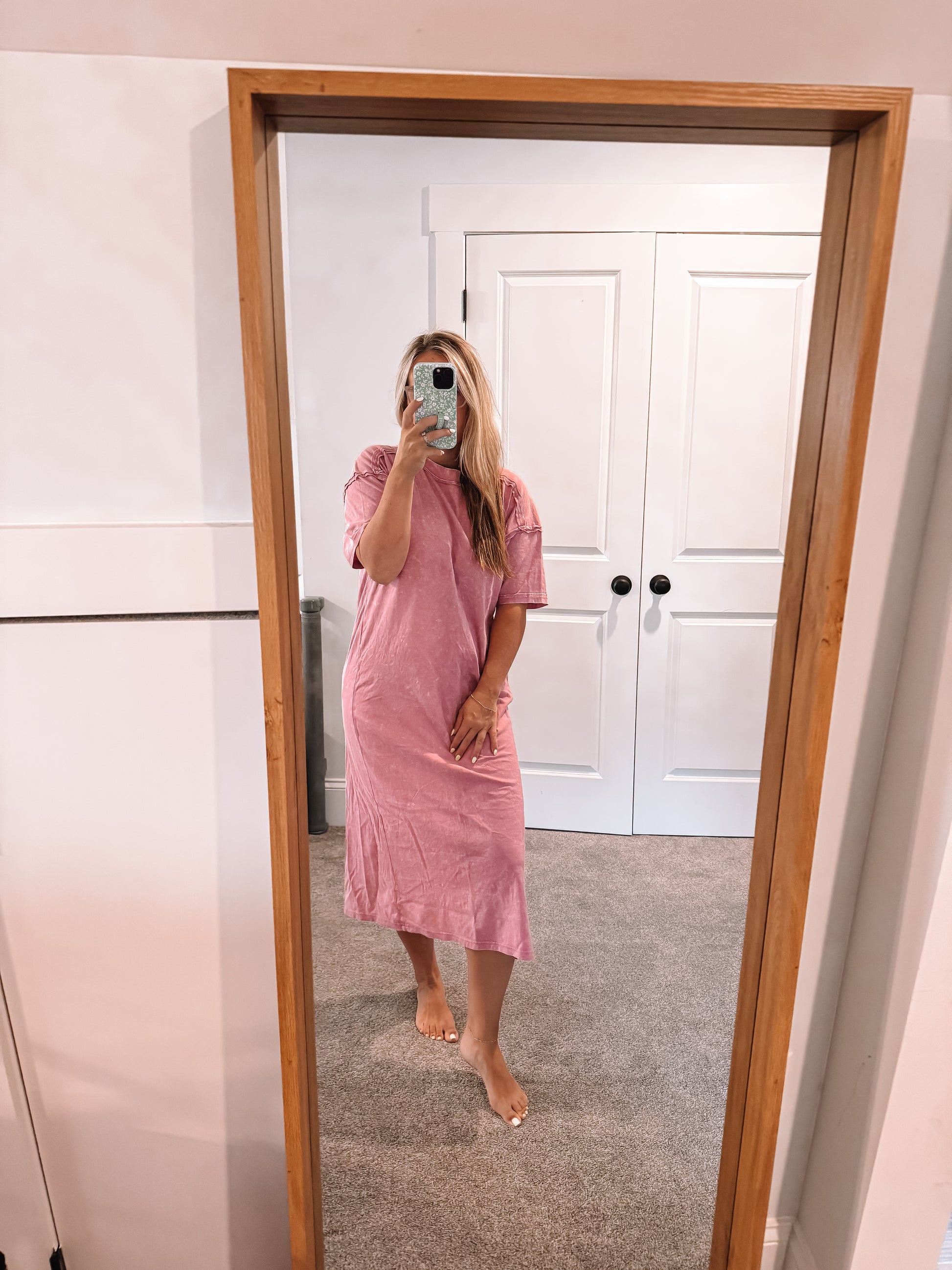 Our Tshirt midi is a mineral wash causal and comfy fit for everyday wear. Oversized fit with side slit detail. Wearing a size small for reference. Easily accessorize this piece to dress up or down depending on occasion.