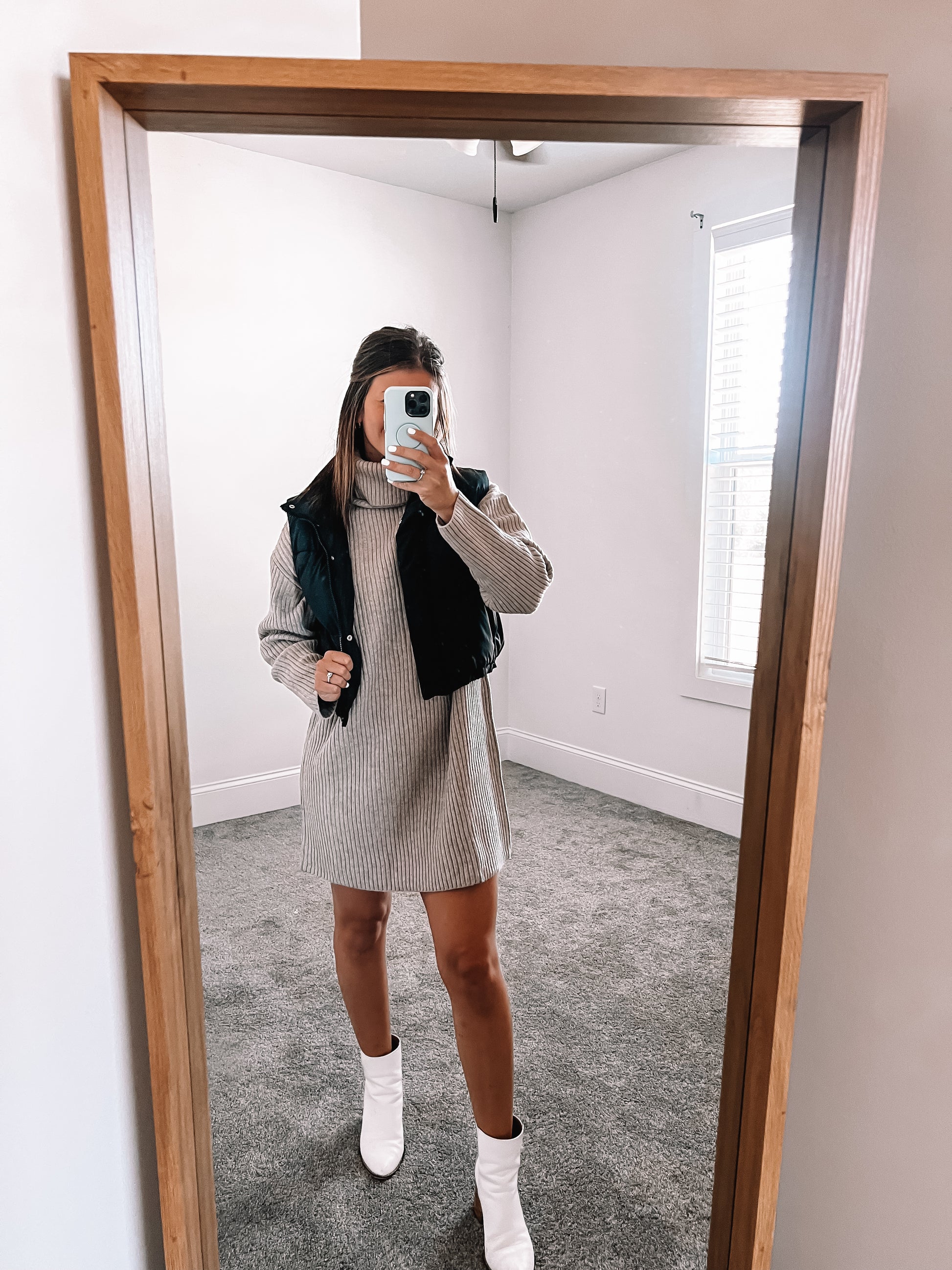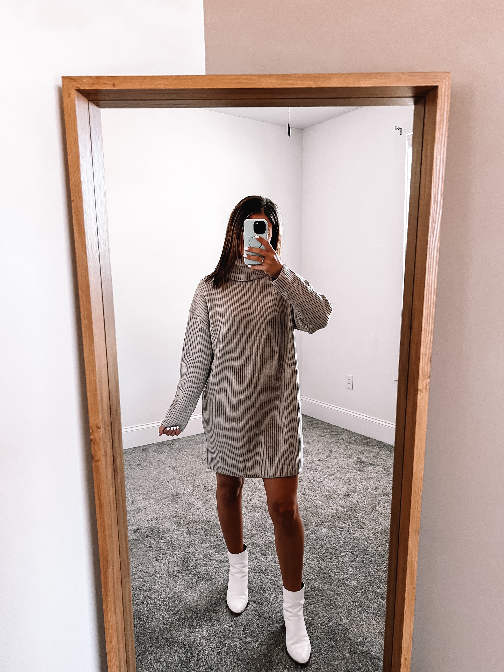 Stay cozy and stylish with our Whitney Sweater Dress. This high-quality dress features a thick turtleneck and a comfortable, soft sweater design. Perfect for any occasion to dress up or down. Wearing a size small.